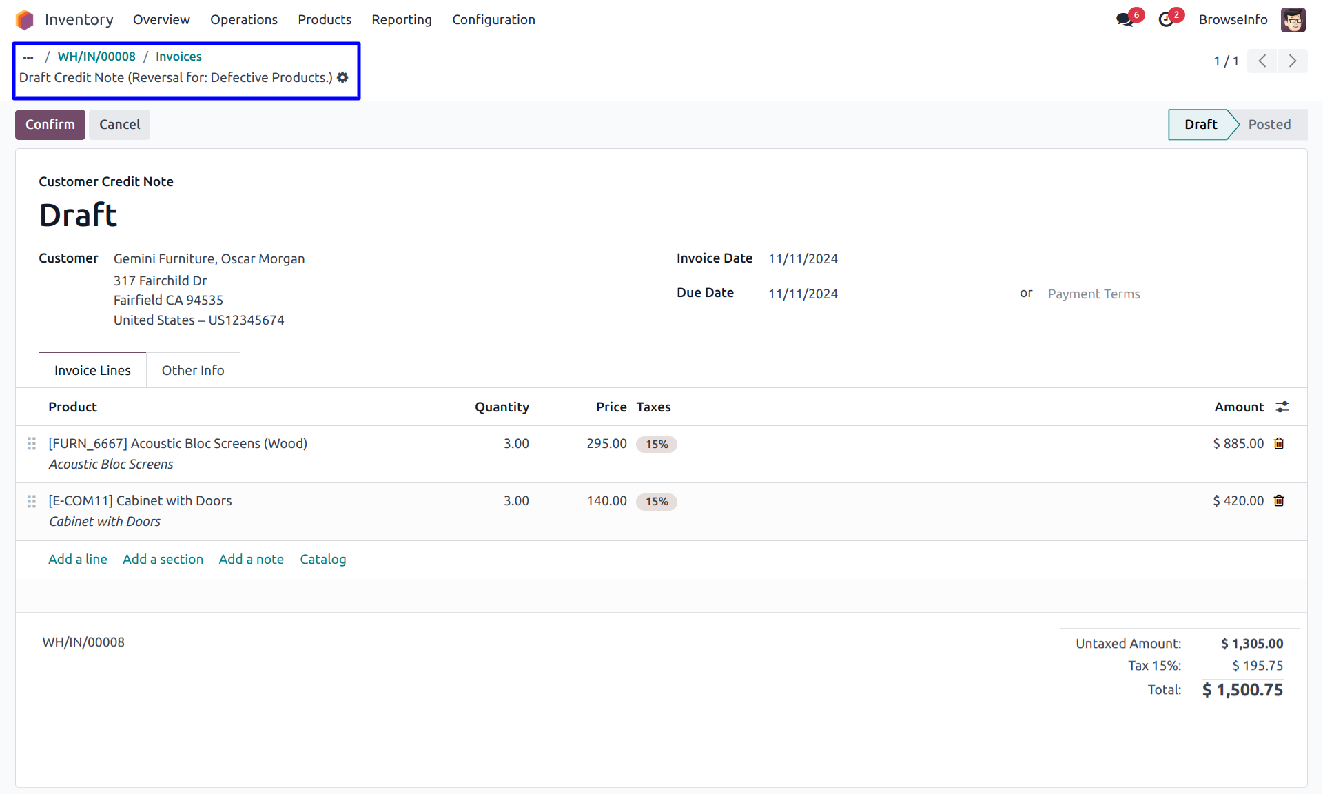 User can see created draft customer credit note for customer invoice of returned delivery order.