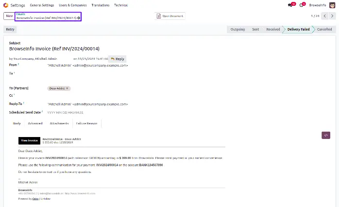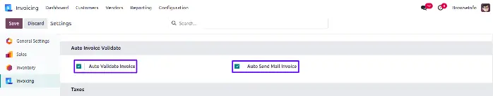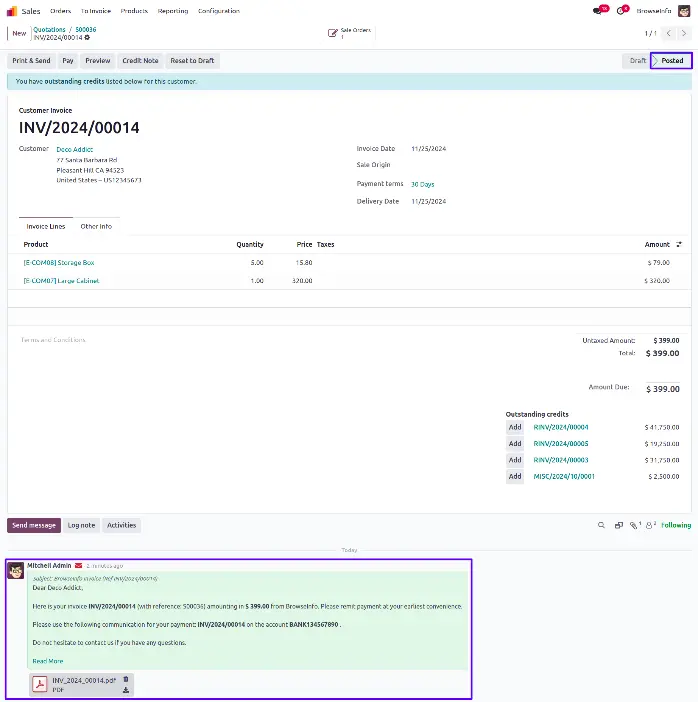 User can see invoice is validated automatically and sent message is linked with chatter which is sent to customer.