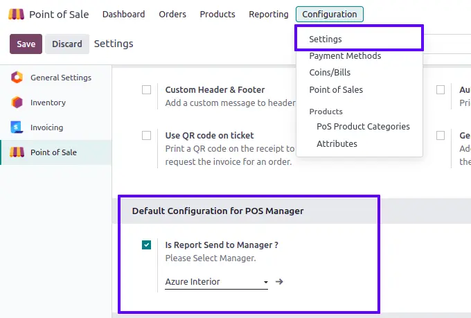 User need to enable the "Is Report Send to Manager ?" option and select default manager for point of sale.