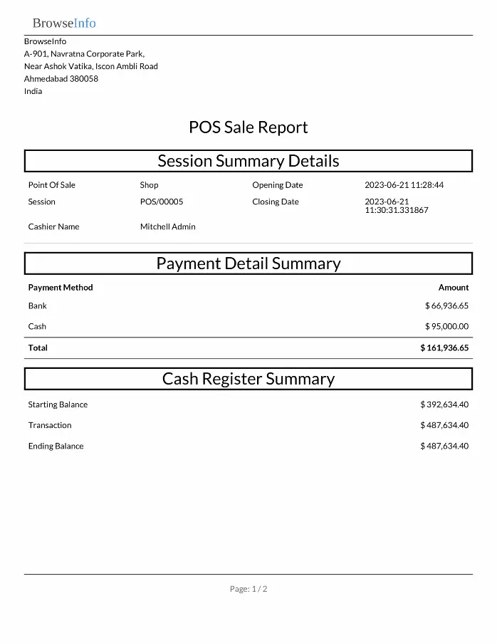 Automatically Transmit POS Sale Report to Manager Odoo app is designed to automate the process of transmitting Point of Sale - POS sale reports to managers. This app streamlines reporting procedures, ensuring that managers receive timely and accurate sales data for better decision-making and performance evaluation. With this app, businesses can set up a default point of sale manager and reports will be sent automatically by email on closing session. These reports provide a comprehensive overview of session summary details, payment summary details, cash register summary, and product summary.