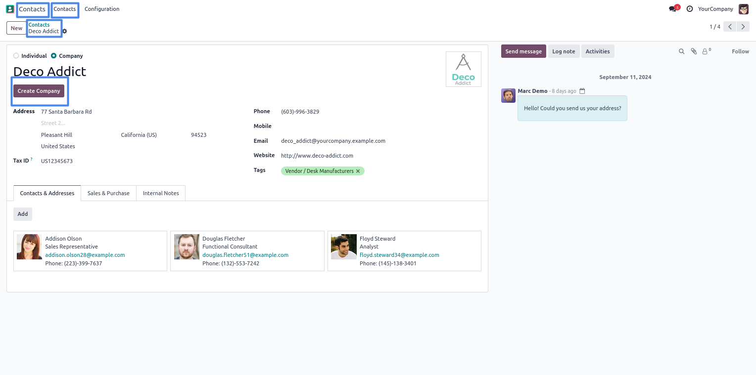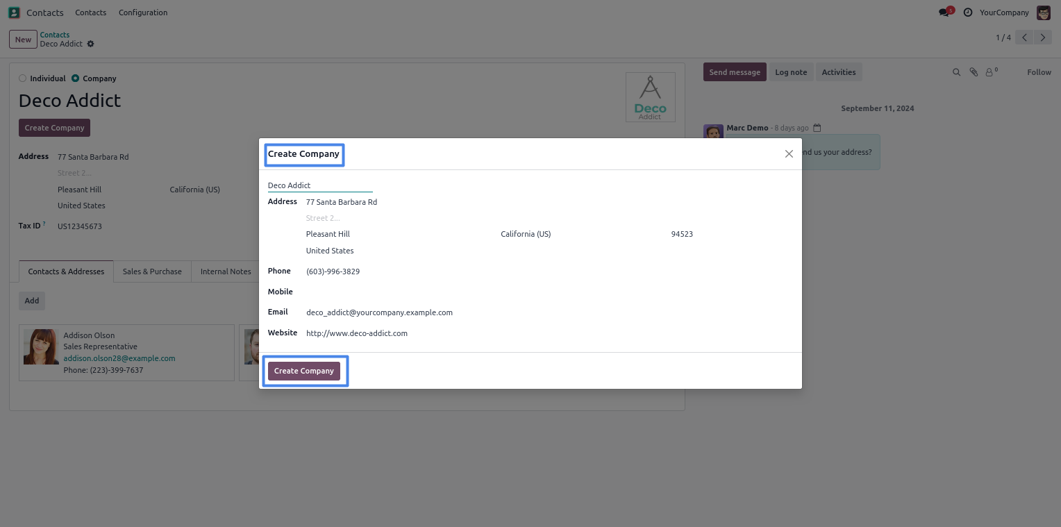 Create Company from the Contact Odoo App helps users to create a new company directly from the contact. Users can see the create Company button in contact's form view, Which contact type is 'Company'. When a user clicks on that button, New company will be created with existing information of contact.
