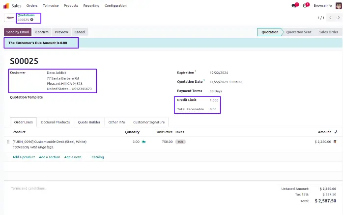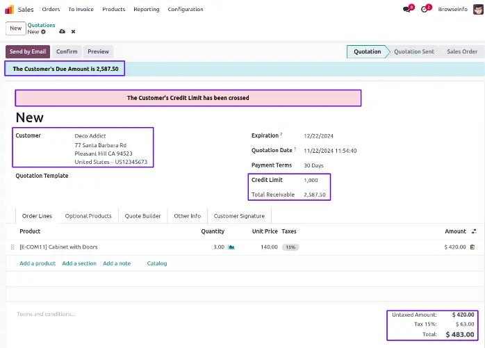 While creating any sale order, customer can see its credit limit, also total amount that is receivable till now. Customer can place sale order even if total receivable is more than credit limit.