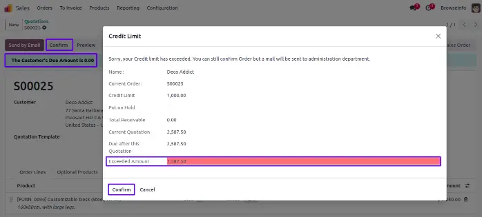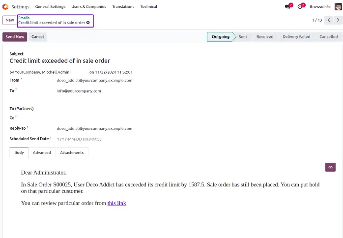 When customer's credit limit is exceeded, on confirming sale order, an auto-generated email will be sent to administration department. Mentioning, sale order name, customer name, amount exceeded and a link to review that particular sale order. also you can view sale order by clicking on given link.