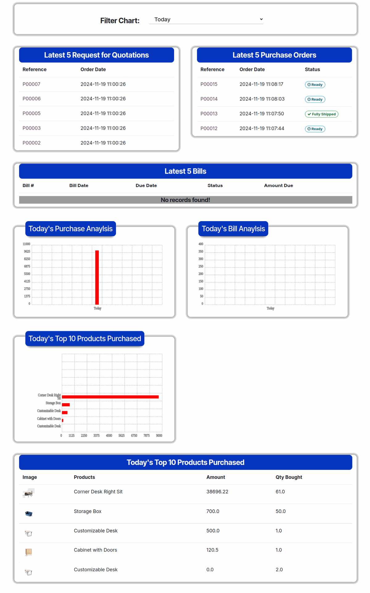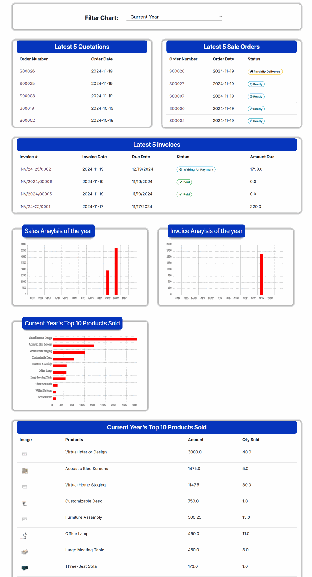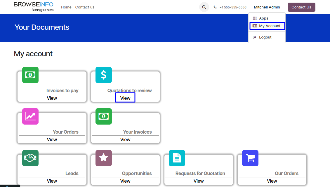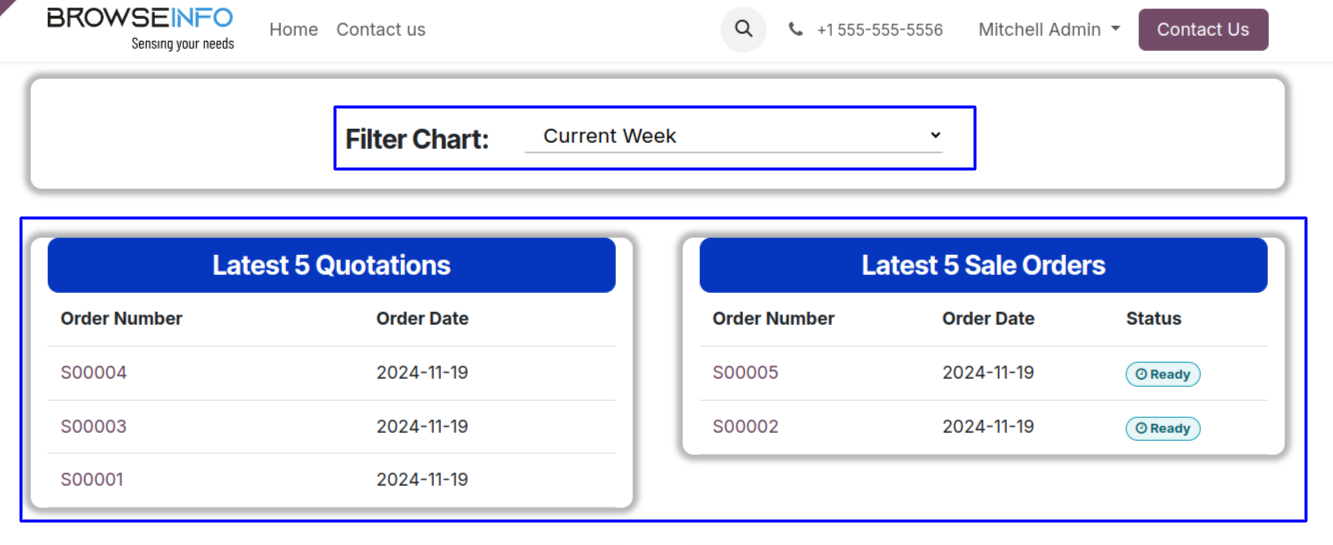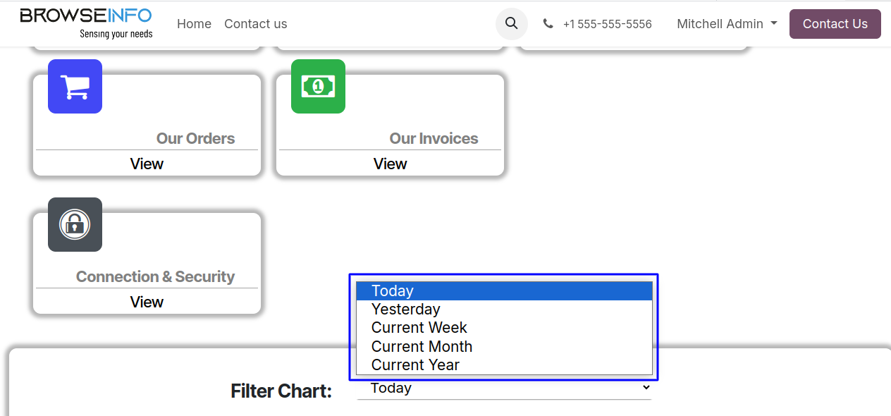 Portal Dashboard odoo app helps user to show attractive website dashboard for portal users. Portal user can see different records with counts and different analysis chart for sales , purchase, invoice, bills, sold products and purchased products, also can see latest quotations, sales orders, RFQs, and purchase orders, invoices and bills with status and projects and task from portal view, Also can filter all charts by today, week, month, year.