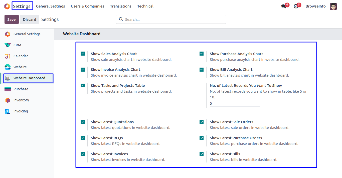 Under "Settings" menu user can configure website dashboard, User have to enter "No. of Latest Records You Want To Show" and as per this number record will show on dashboard.
