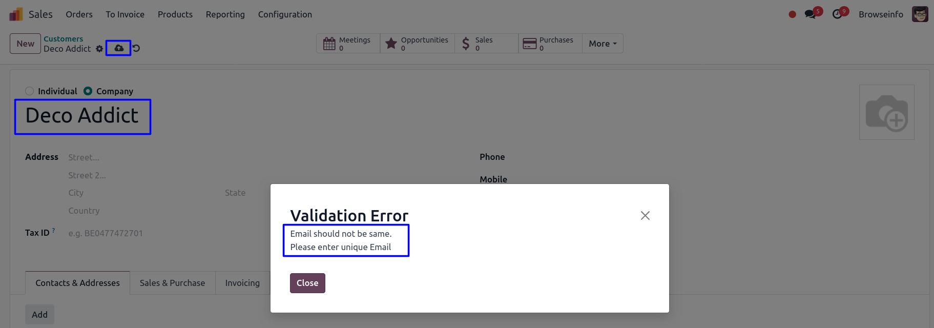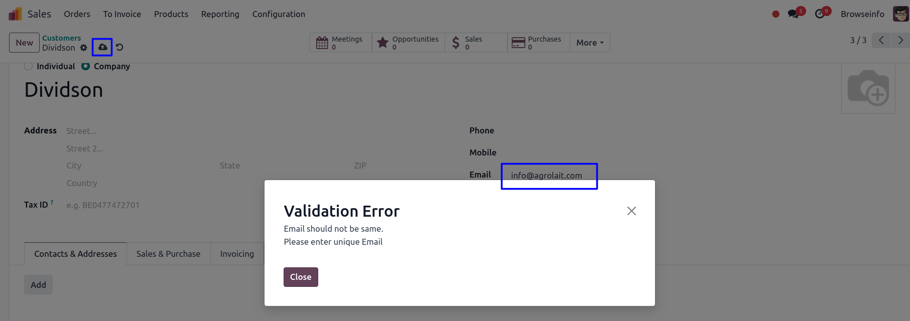 Duplicate Contact Validation Alerts Odoo App helps to select fields to check for duplicate value in customer or contact. When a user creates unique fields and enters the same value in customer or contact that time raises a warning/validation message so it will help to avoid duplicate entries for contact/customer. You have the choice to select multiple fields for the duplication check and according to that validation check for selected fields and alerts appear when users try to enter duplicate details.