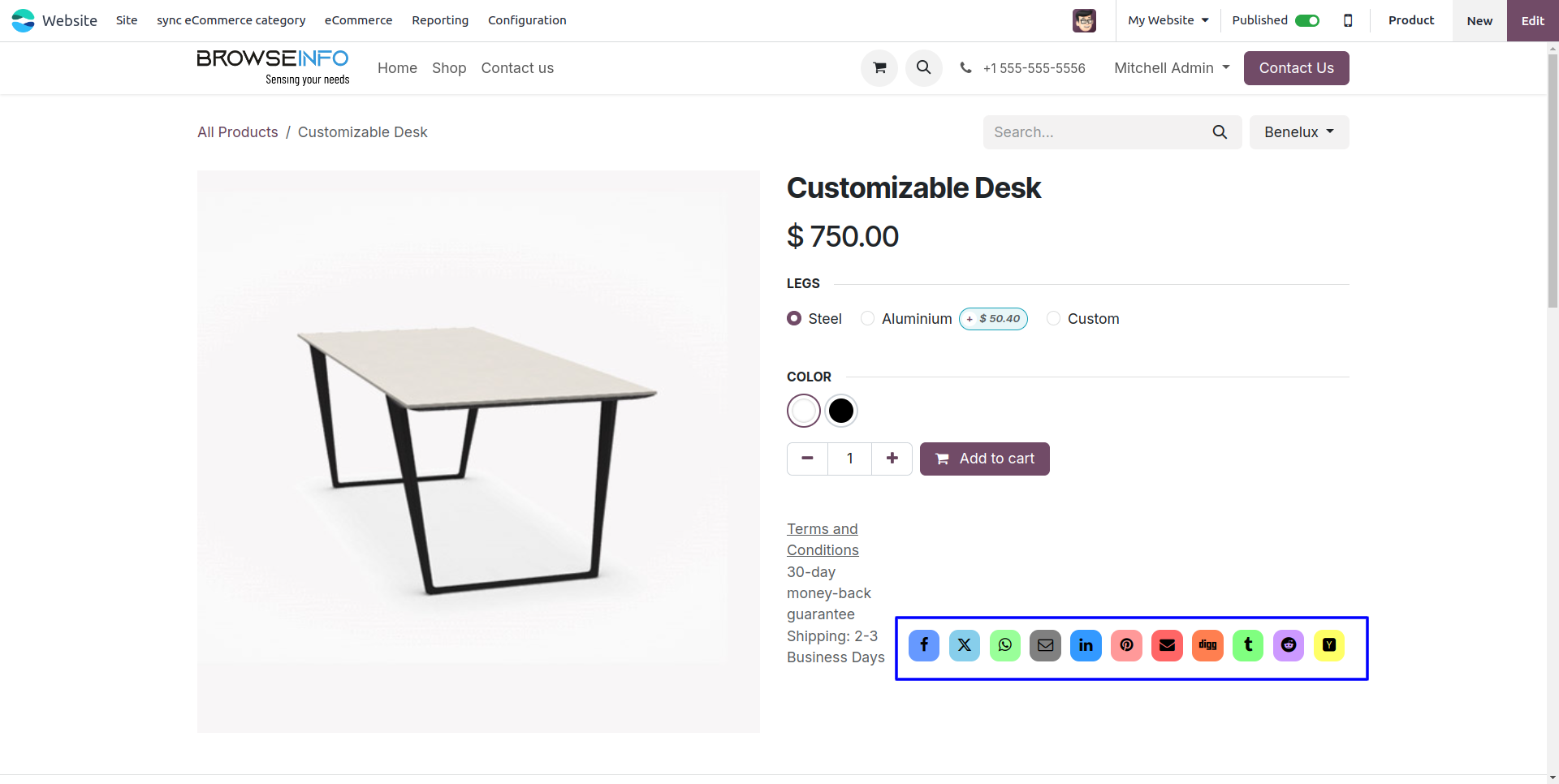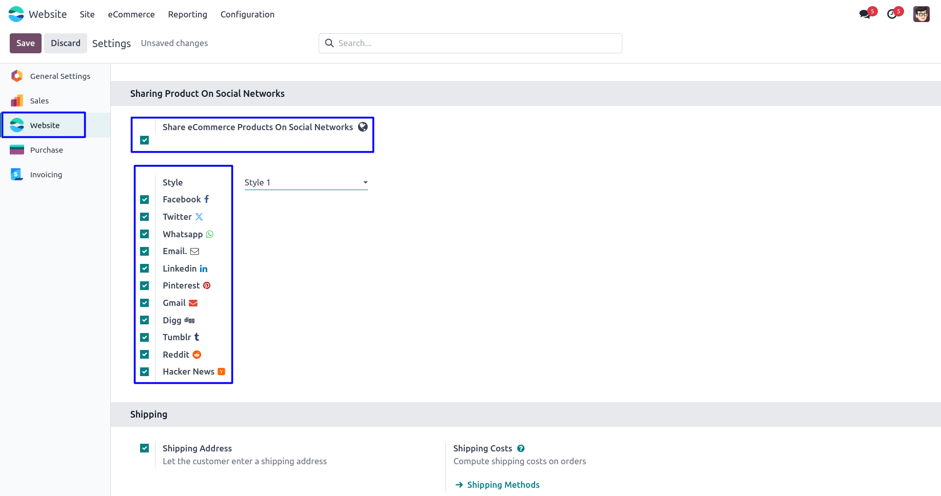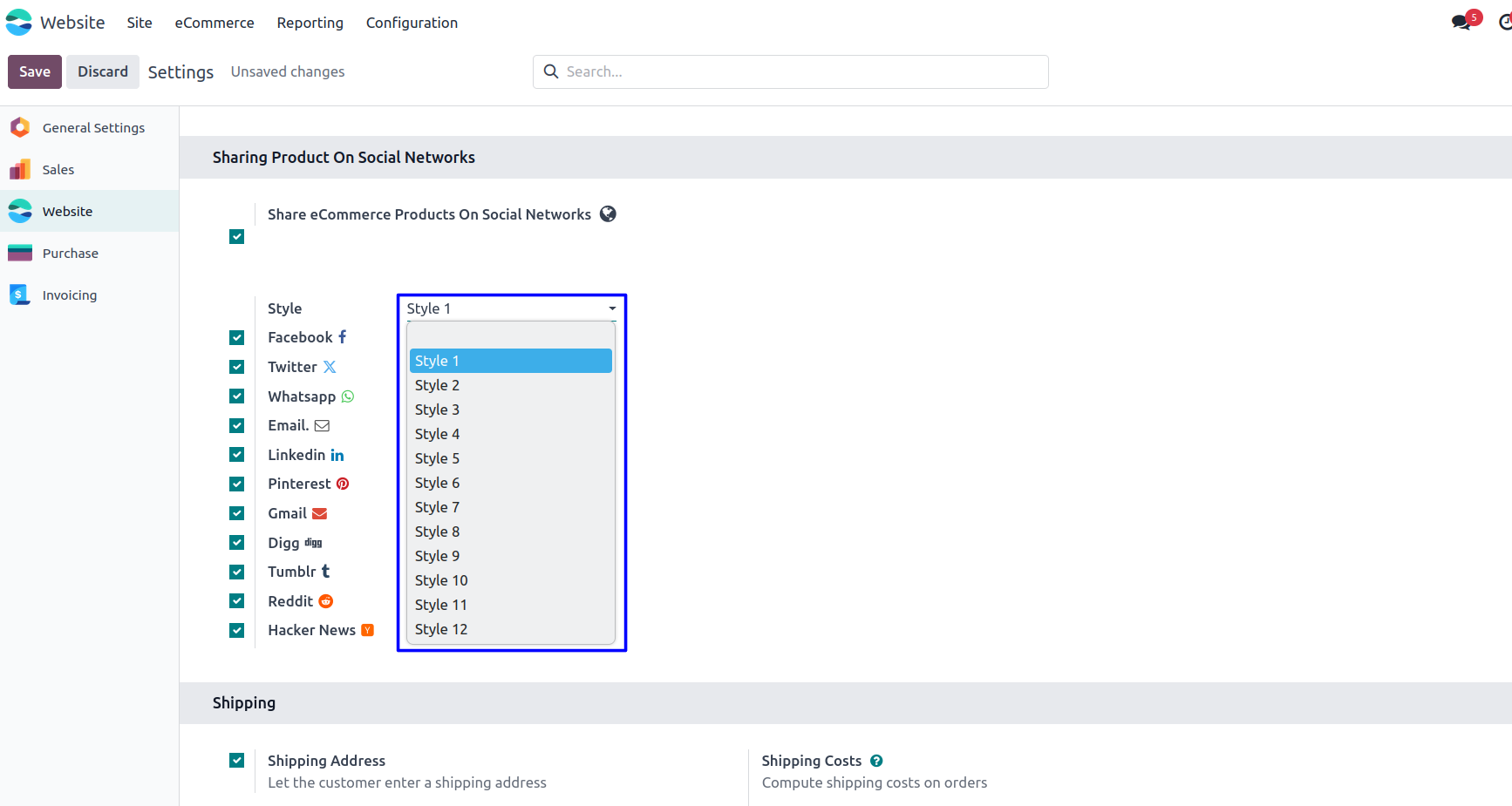 E-Commerce product Social Network Share Odoo App is used to share eCommerce products on social networks like facebook, twitter, whatsapp, email, linkedin, pinterest, gmail, digg, tumblr, reddit and hacker news. User can enable/disable social media platform from website configuration and also use different styles for social media sharing.