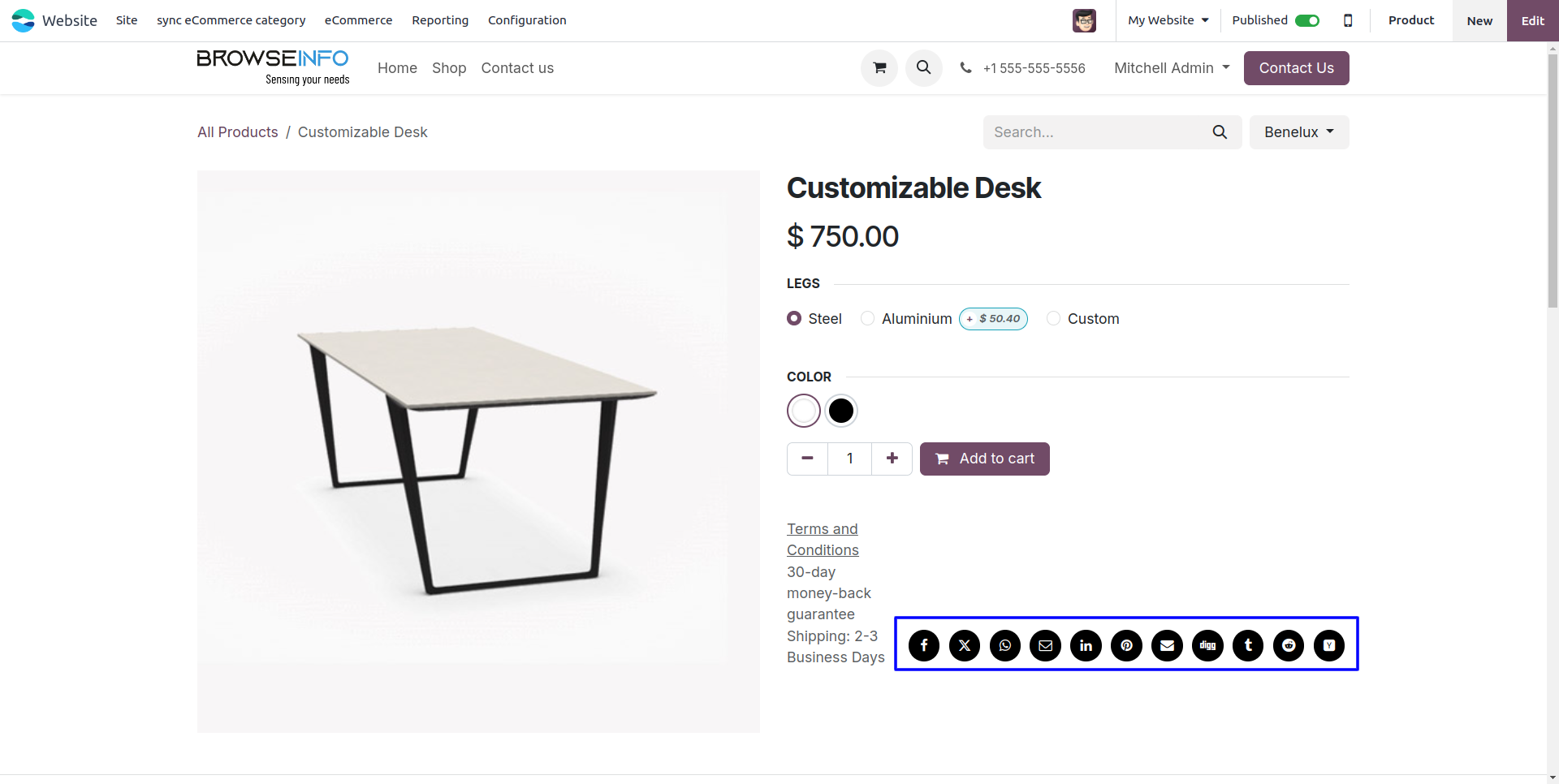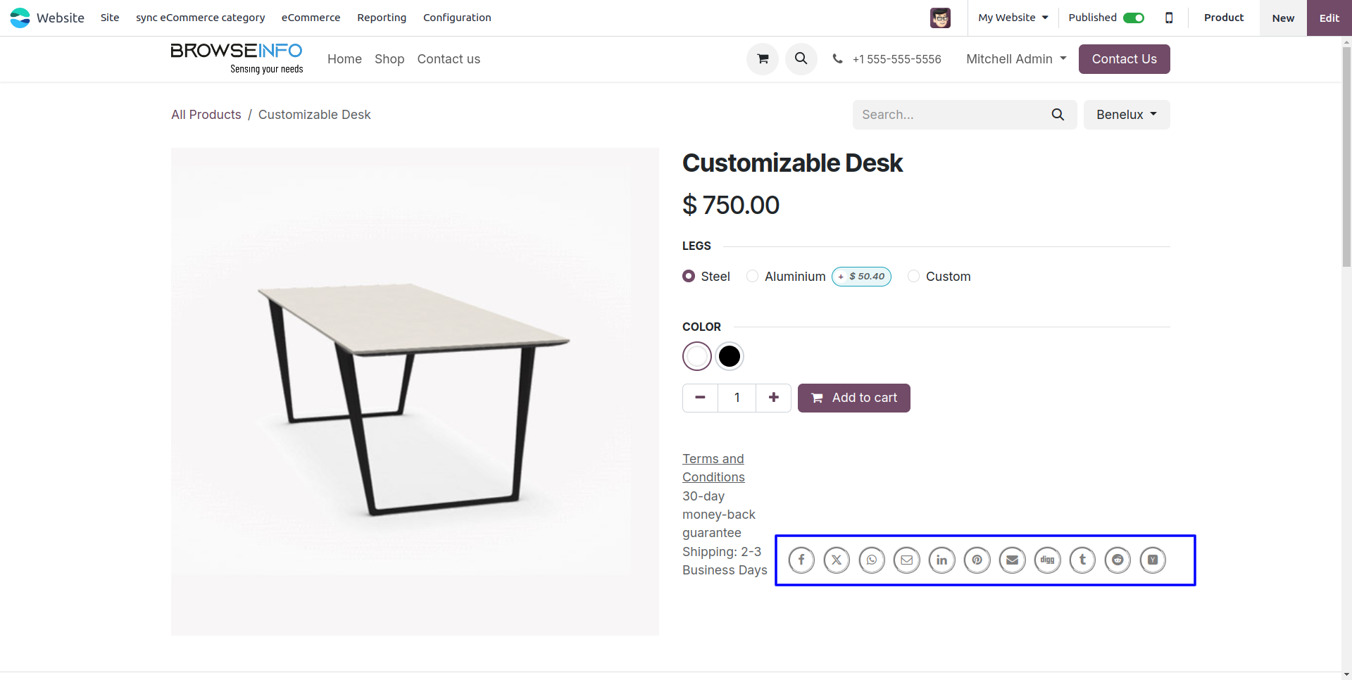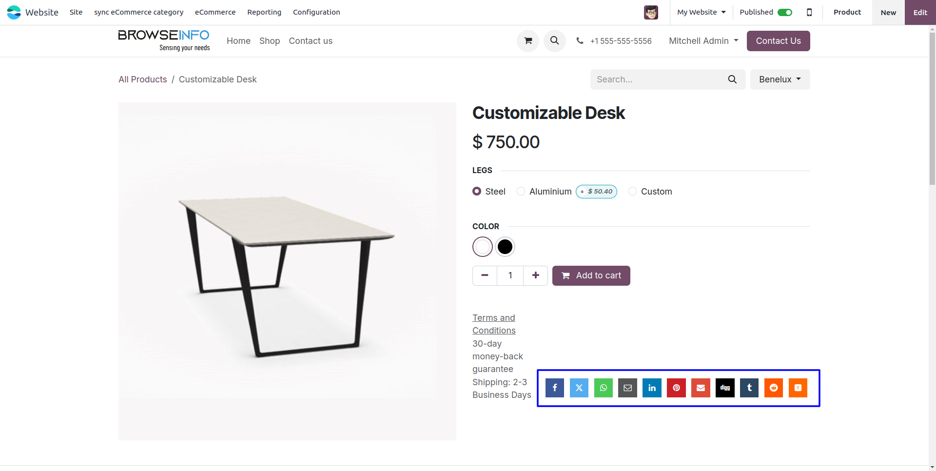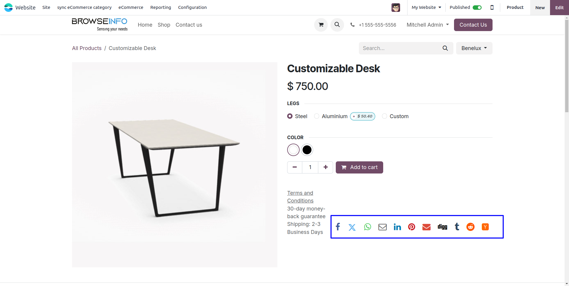 E-Commerce product Social Network Share Odoo App is used to share eCommerce products on social networks like facebook, twitter, whatsapp, email, linkedin, pinterest, gmail, digg, tumblr, reddit and hacker news. User can enable/disable social media platform from website configuration and also use different styles for social media sharing.