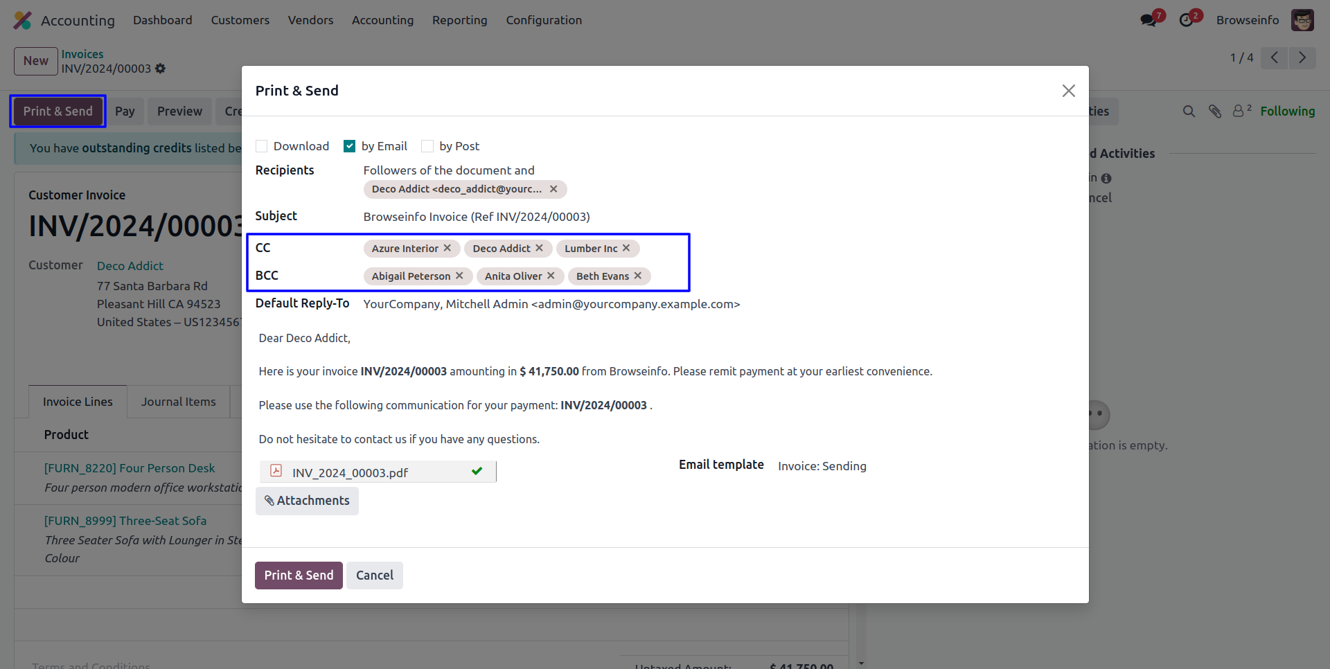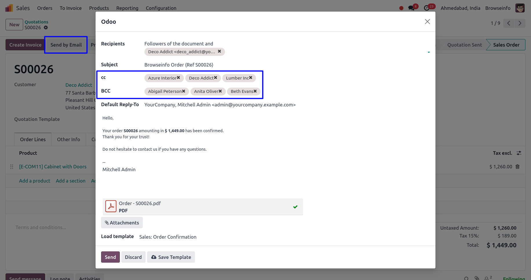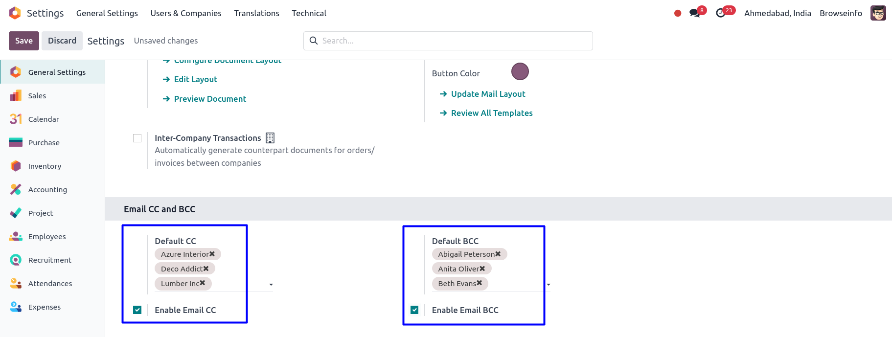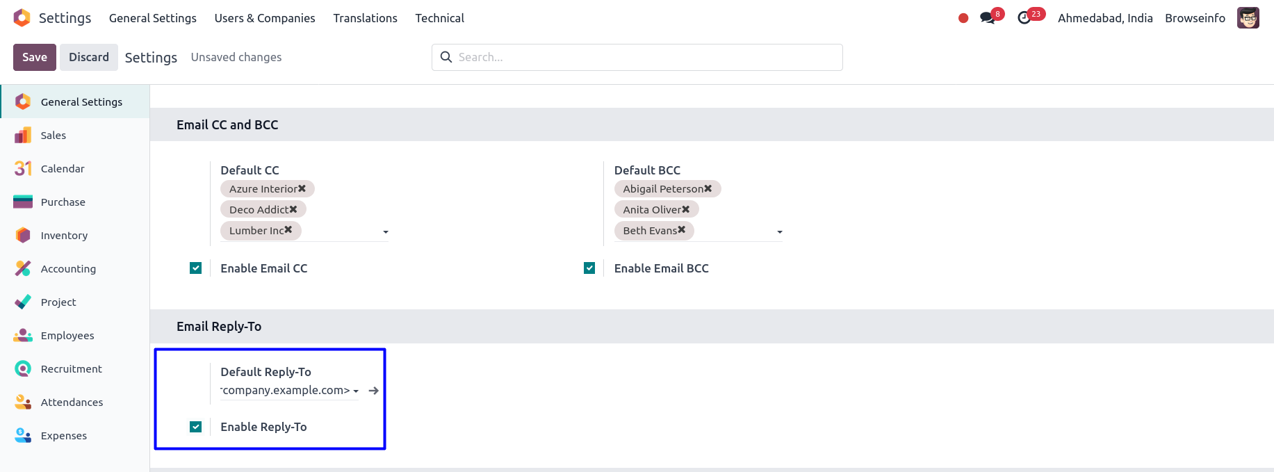 Advance Mail Composer - Email CC BCC Odoo App helps users to send email to multiple customers in cc and customers partners in bcc of mail with specific reply to option. Users can select contact as cc, bcc and also make then visible in emails by enabling them from general settings. This app also provide option for email reply to which helps to add default reply to on configuration which set as reply to email for every sent mail from Odoo.