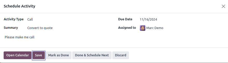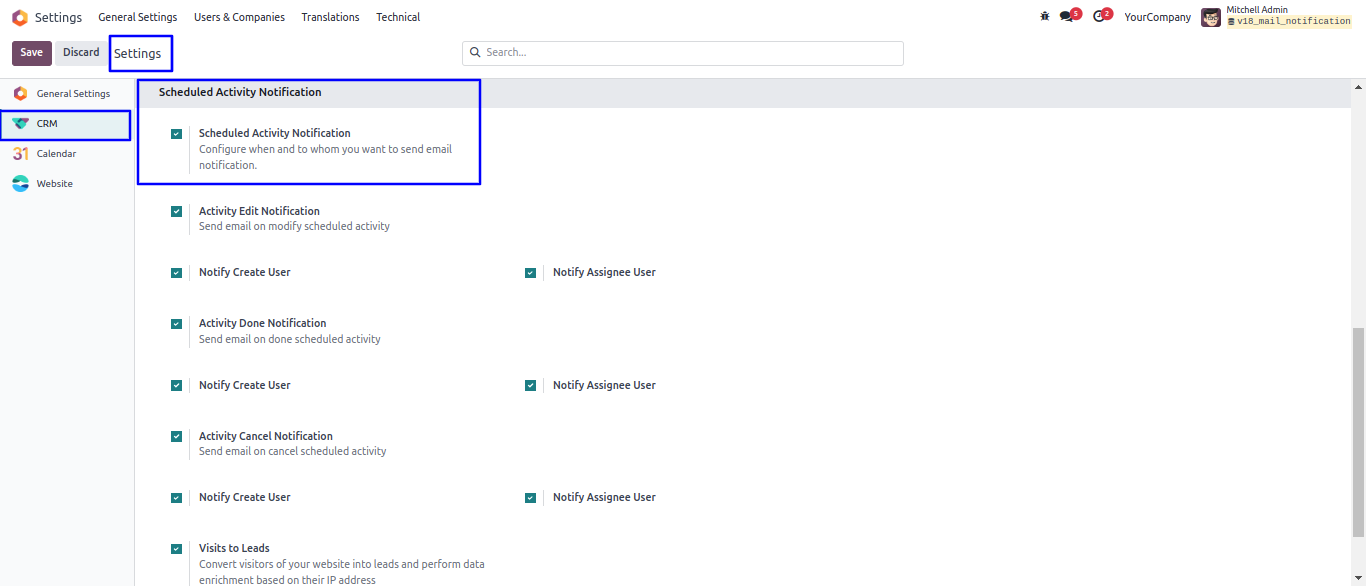 Under CRM > Configuration > Settings menu user have to enable "Scheduled Activity Notification". User have to enable "Activity Edit Notification" if user wants to notify on edit scheduled activity, Enable "Activity Done Notification" to notify on done scheduled activity, and enable "Activity Cancel Notification" for notify on cancel schedule activity. User can enable "Notify Create User" and "Notify Assignee User" for specific option and user will get email notification.