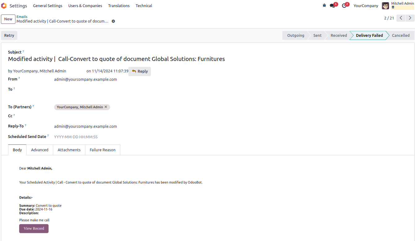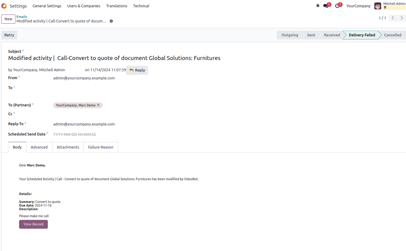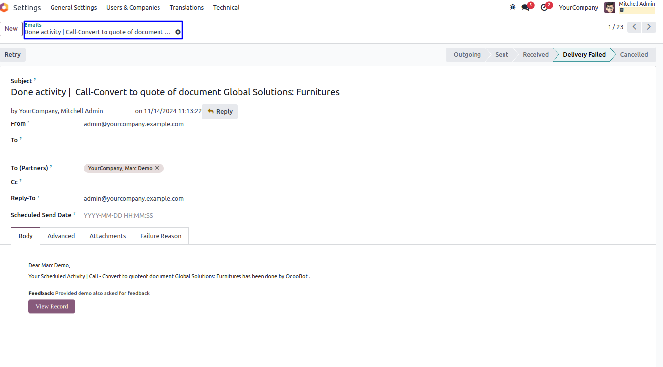 Email Notification for Activity odoo app helps user to send email notification for scheduled activity. Email notification send based on edit, done or cancel scheduled activity both create user and assigned users and according to the configurations users will get email notification. All these notification is configurable you can configure notification according to actions of activity such as edit activities , cancel activities and done activities.