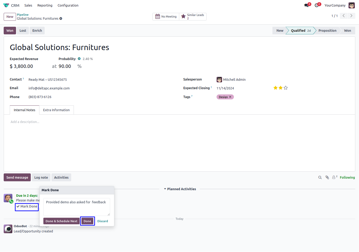 When user done scheduled activity create user and assigned user will notify as configuration.