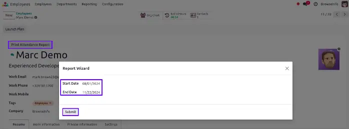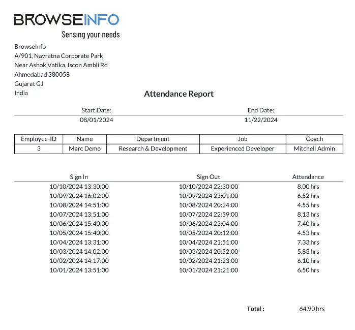This Odoo apps helps to generate and print Employee Attendance sheet Report. For every HR system, employees sign in and sign out reports are very useful. After installing this odoo module HR manager can print and download all employees login and sign in/out reports as Attendance Sheet reports with start date and end date filters.