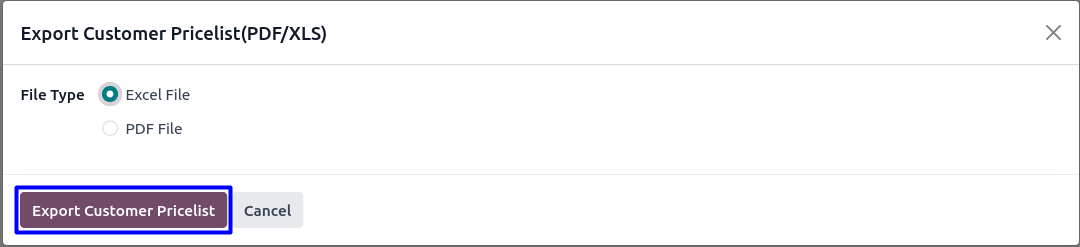 After selection file type as 'Excel File', User have to click on "EXPORT CUSTOMER PRICELIST" button to generate Excel report for selected customers.