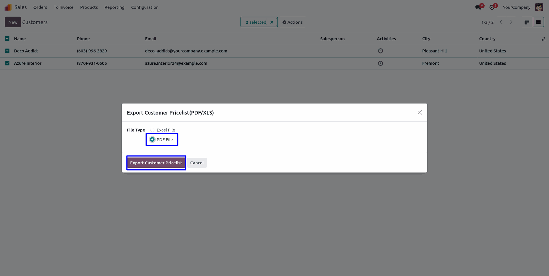 After selection file type as 'PDF File', User have to click on "EXPORT CUSTOMER PRICELIST" button to generate PDF report for selected customers.