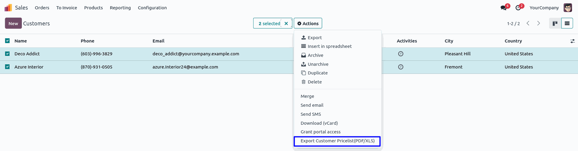 Under customer list user can select multiple customer, In action menu user can see "Export Customer Pricelist(PDF/XLS)" menu to export selected customers pricelist.