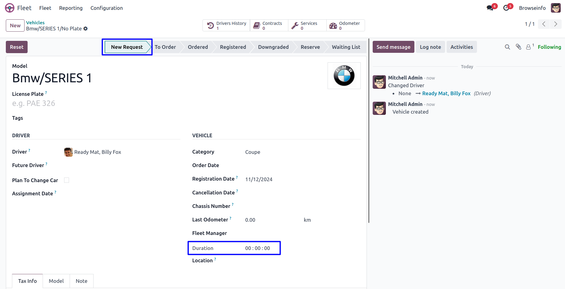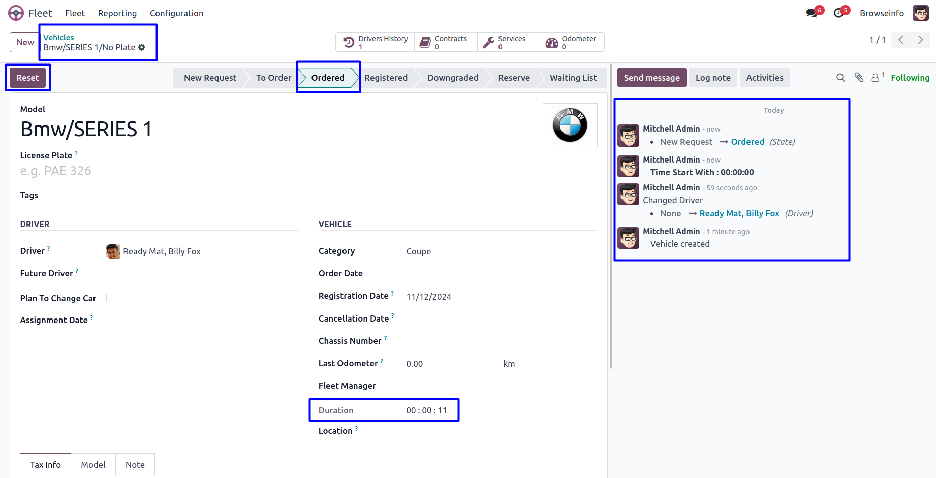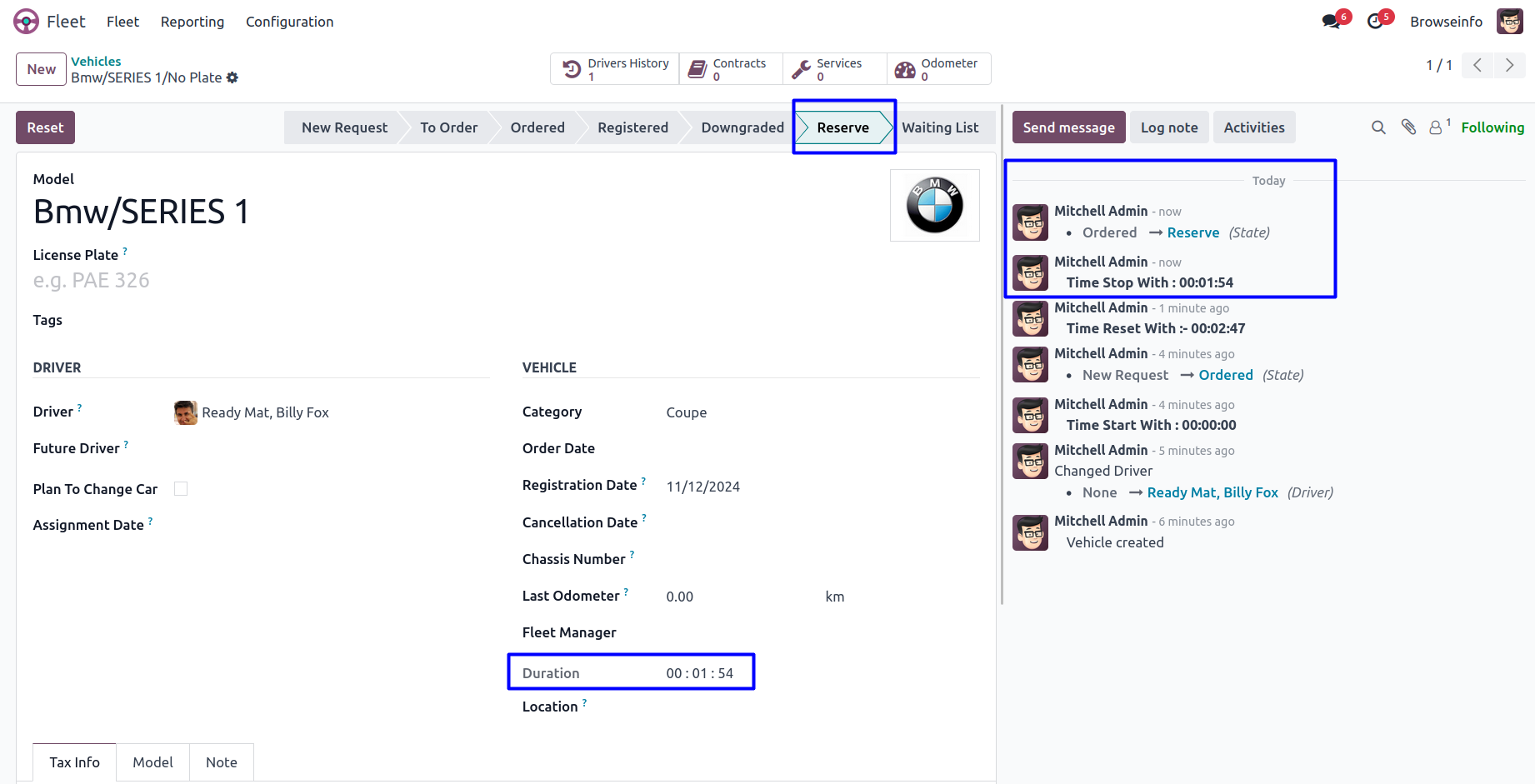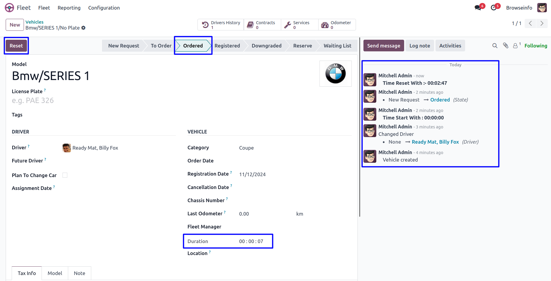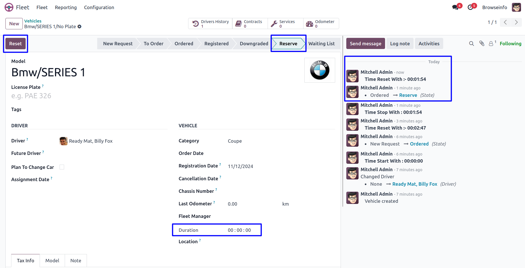 Fleet Management Timer Widget Odoo App helps users to configure or select more than one start fleet timer stage and stop fleet timer stage. Users cannot use the same stage in both start and stop timers. When user move fleet task into start fleet timer stage, timer will be start to count duration and when move fleet task into stop fleet timer stage, timer will be stop to count duration. Users can easily reset the timer, so it will start counting with zero. Users can also view start, stop and reset fleet task timer log into the chatter.