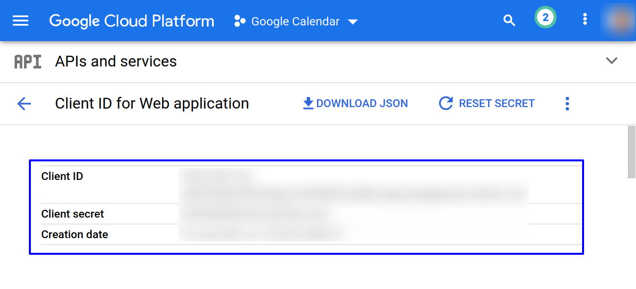 On clicking "Create" button user will get "Client ID" and "Client secret" key for google calendar api.