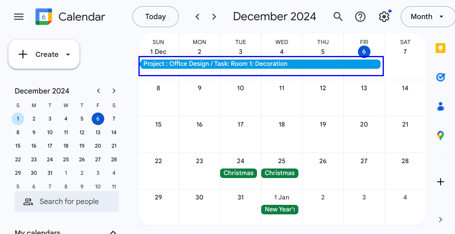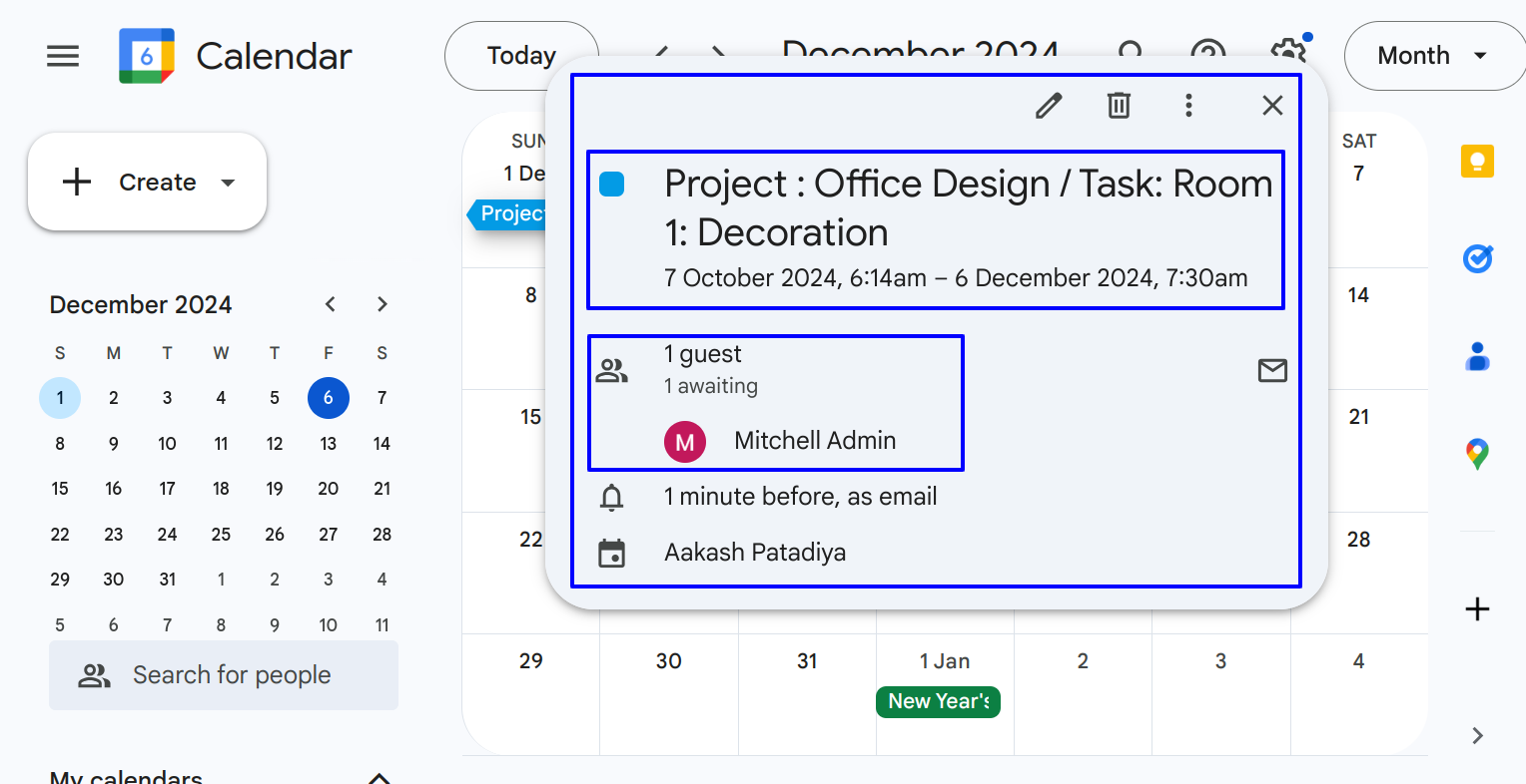 On clicking google calendar event user can also see all task details like project and task name, create date and time, attendee, description, and user.