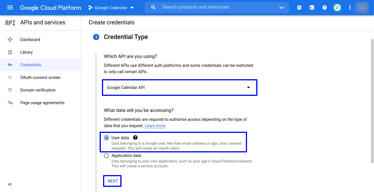 Select "Google Calendar API" as api and "User Data" as data accessing and click "Next".