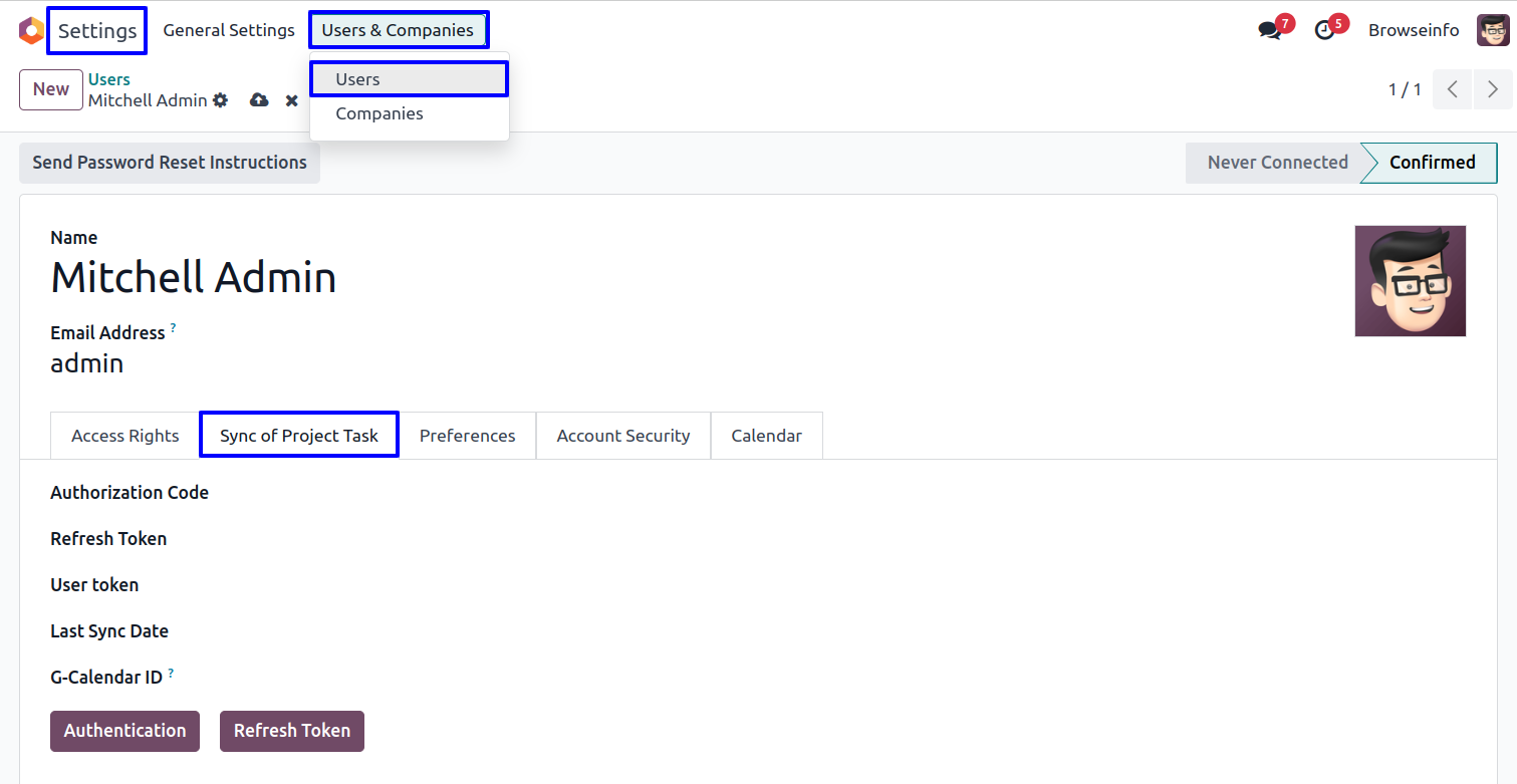Under Settings > Users and Companies > Users menu under "Sync of Project Task" tab user need to click "AUTHENTICATE" button.