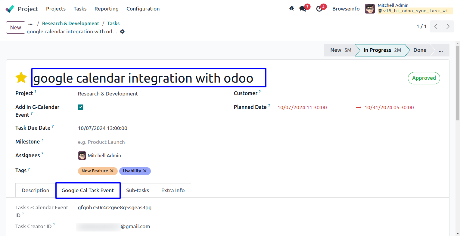 oogle Calendar Integration for Project Tasks odoo app helps users to sync project tasks with google calendar. Users have the option to sync tasks with google or not and on creating tasks user and customer both will get notified by email. Users can get all task information like name, description, create date time, deadline, and attendee, If a user updates a task then google calendar events also get updated.