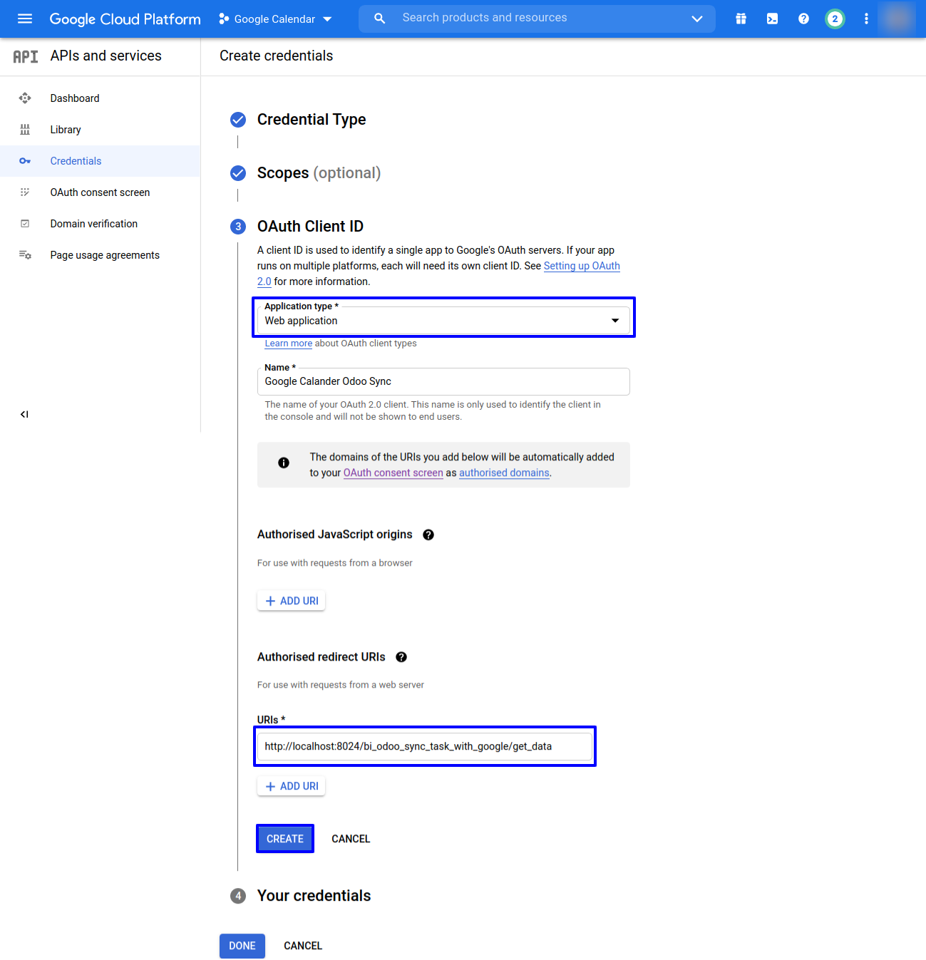 Authorized redirect URl is "http://localhost:8024/bi_odoo_sync_task_with_google/get_data".