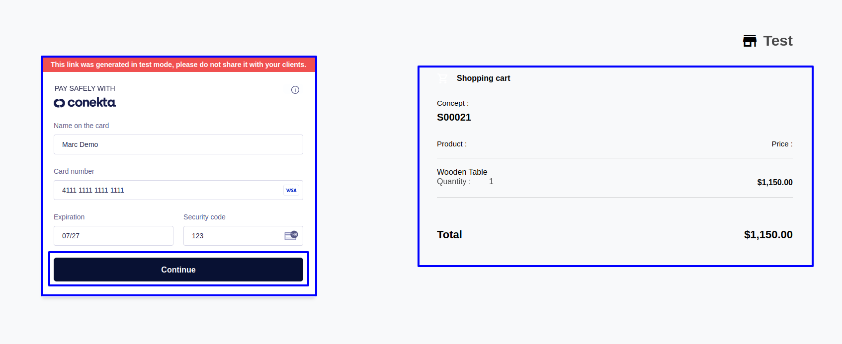 After selecting Conekta for payment, user will be redirected to payment page, on that page user will need to enter their card details and click on the "Continue" button .