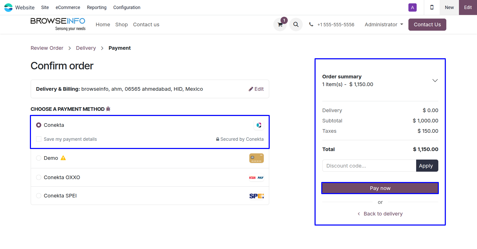 Once configured, customers will see Conekta as a payment option when confirming their order on your Odoo website.