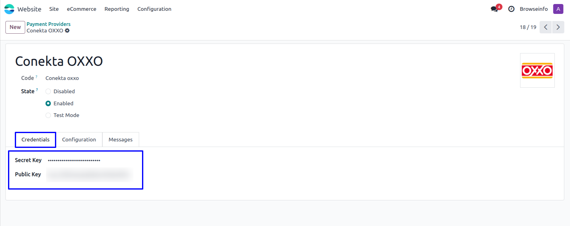 User need to enter Conekta Secret Key and public key in Conekta OXXO payment provider in Odoo.