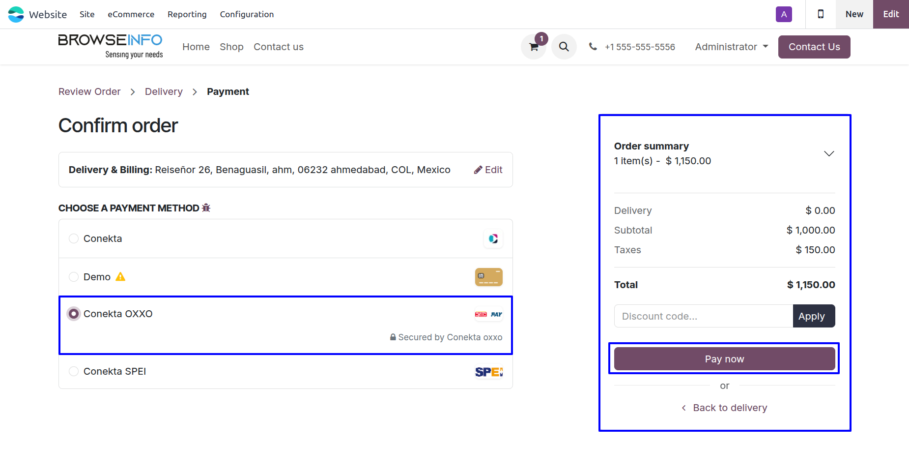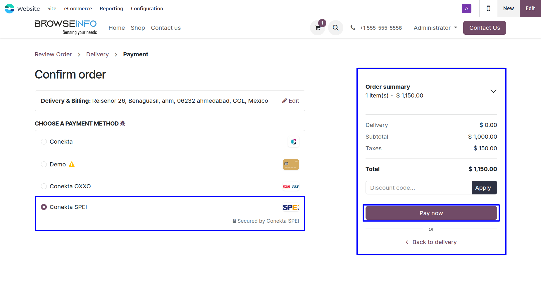 Once configured, user will see Conekta SPEI as a payment option when confirming their order on your Odoo website.