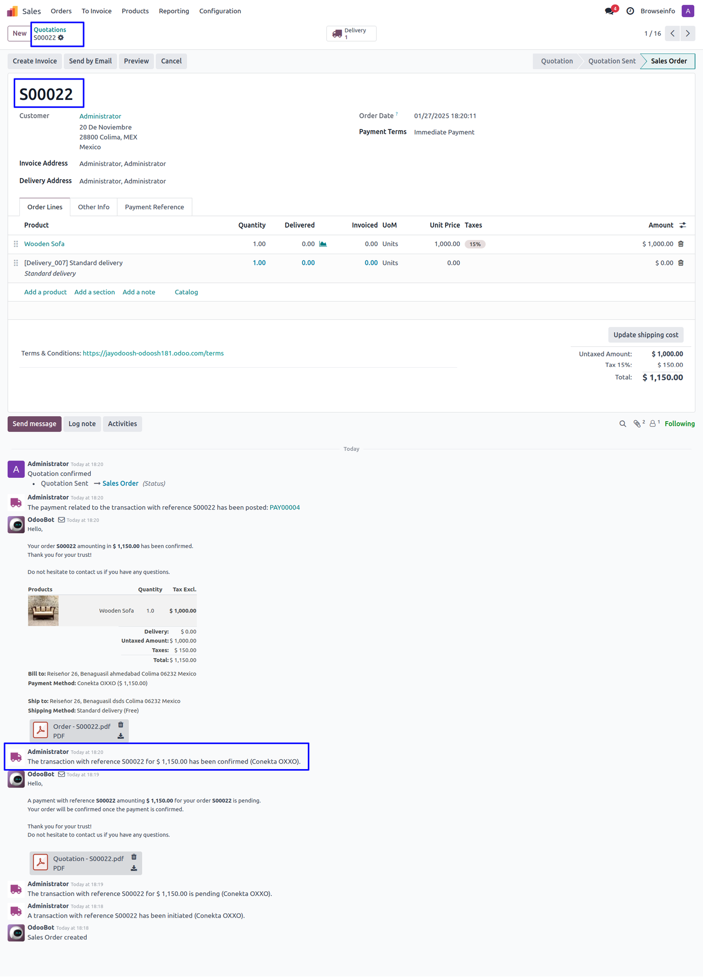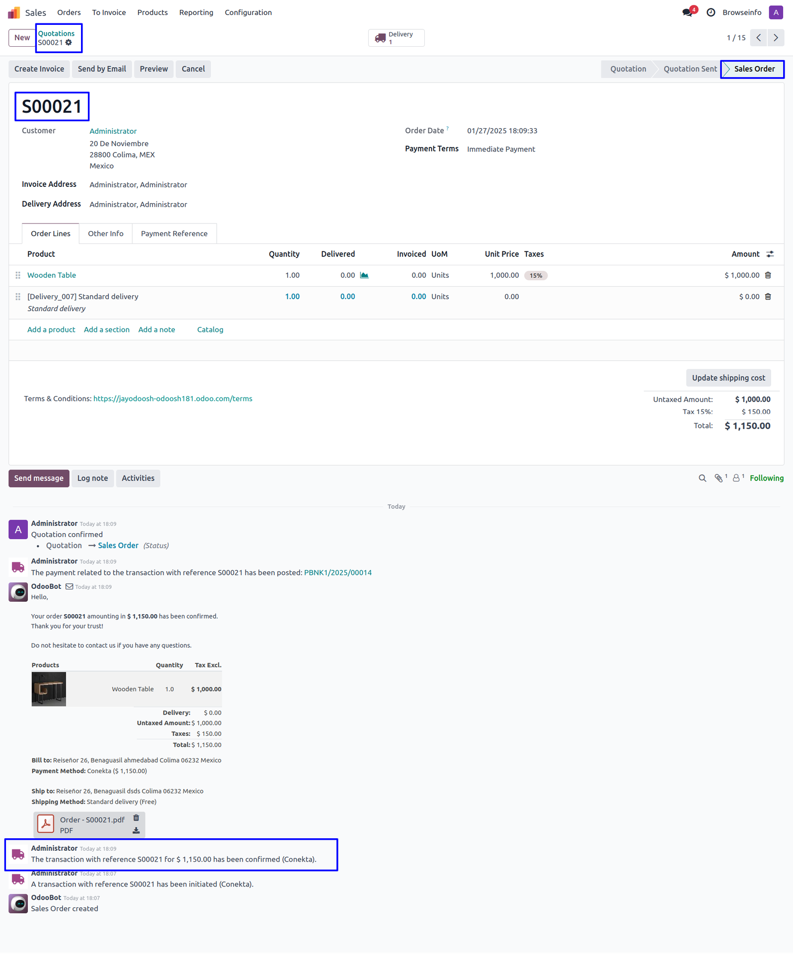 Fig. shows the sale order with Total Amount of ordered products and payment detail.