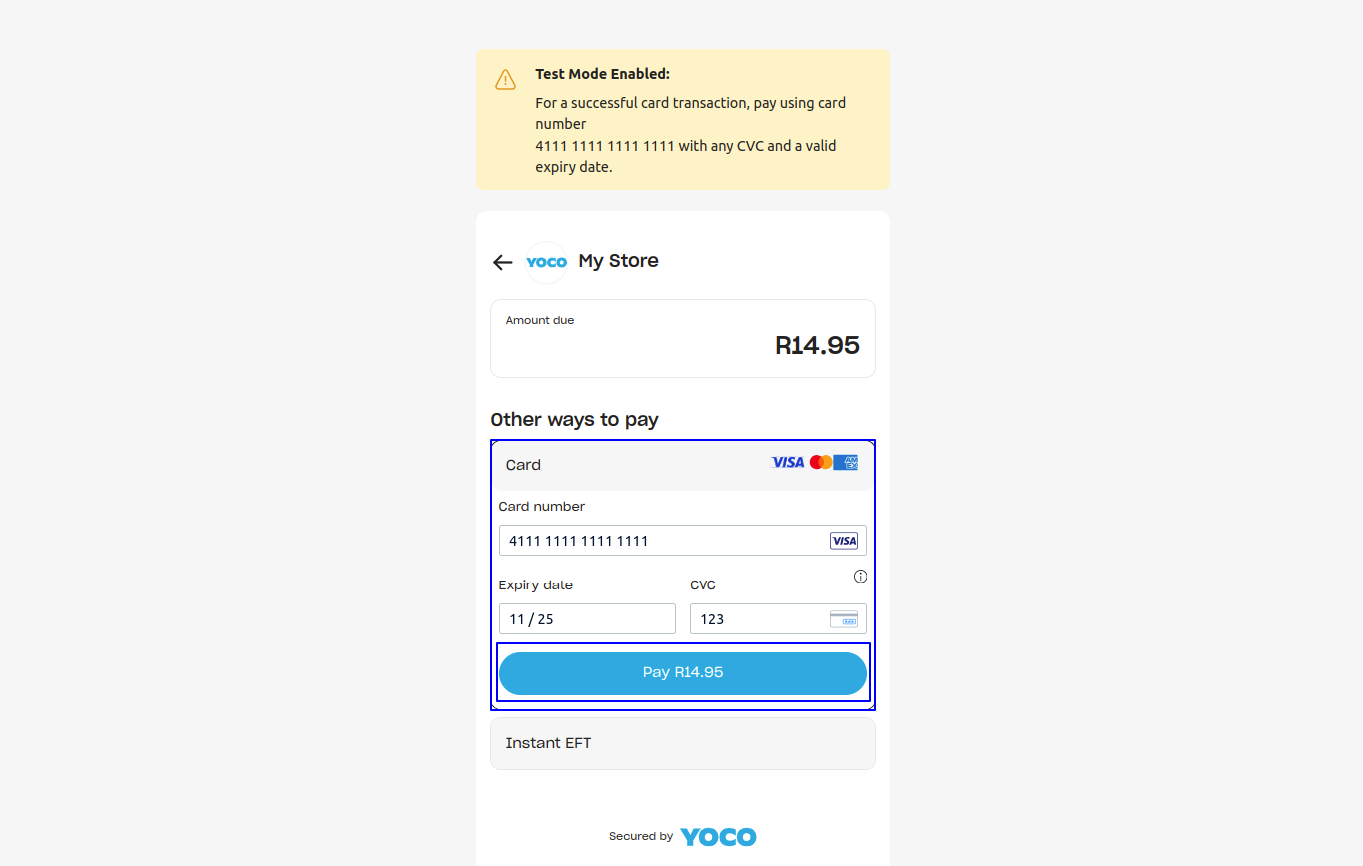 After selecting Yoco for payment, customers will enter their card details and click the "Pay" button to complete the transaction