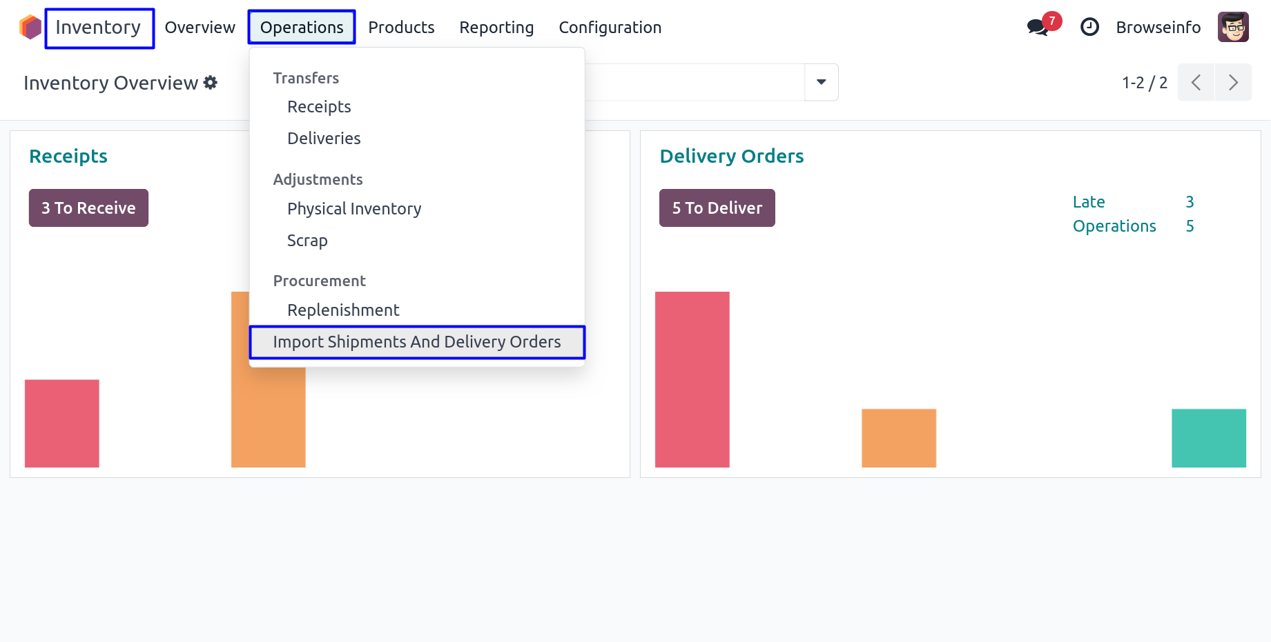 Figure shows the menu of internal transfer, import shipments and delivery.