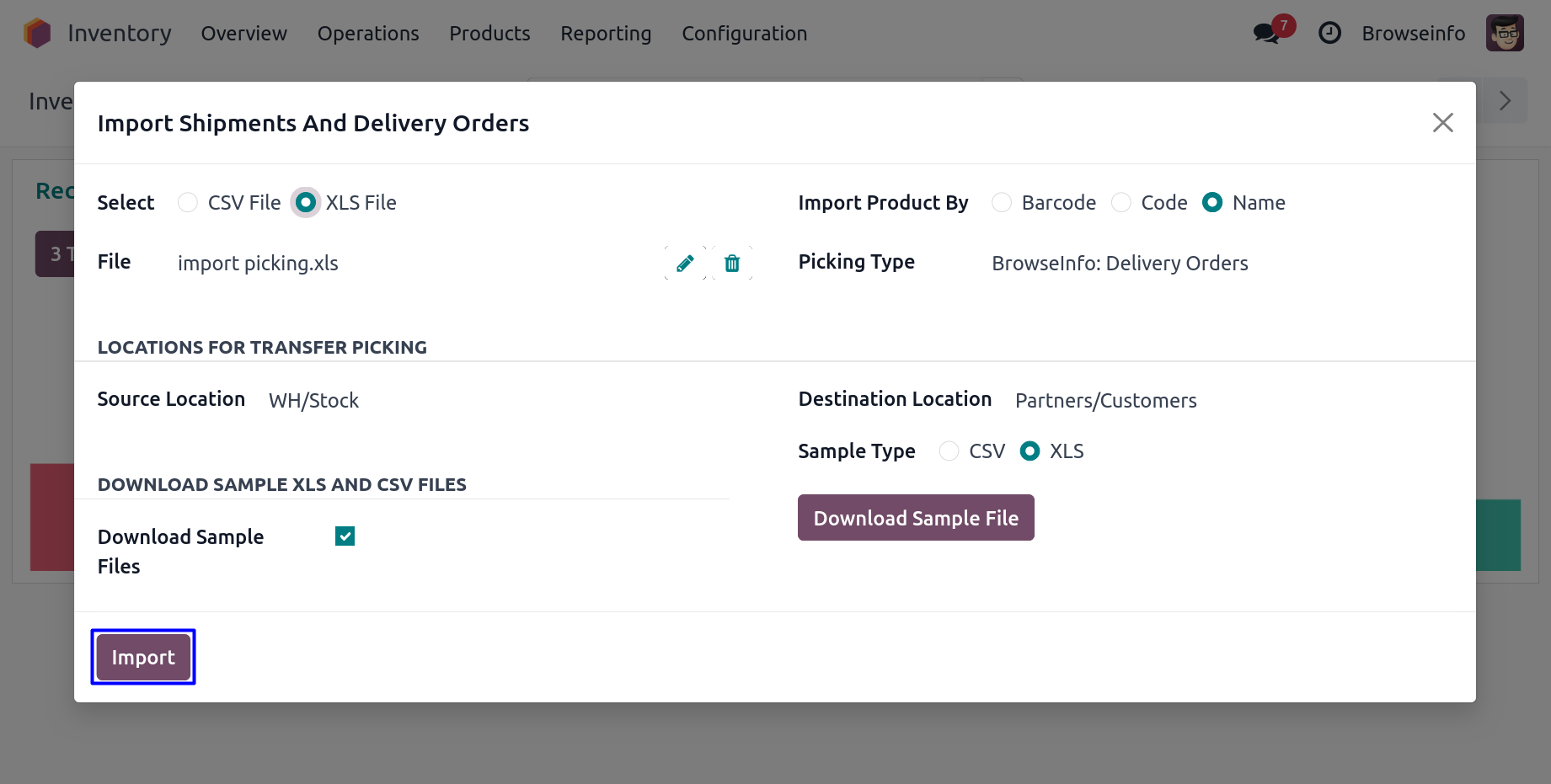 Source Location Zone and Destination Location Zone will be set based on selected picking type from wizard. User can download sample file to import shipment or delivery order by enable "Download Sample Files" option and select "Sample Type" as CSV or XLS and click "DOWNLOAD SAMPLE FILE" button on wizard.
