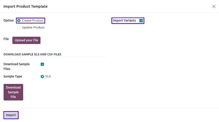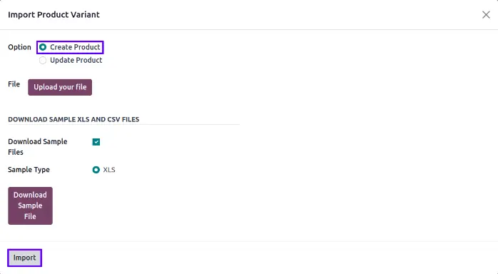 User can download sample file to import product variants by enable "Download Sample Files" option and select "Sample Type" as CSV or XLS and click "DOWNLOAD SAMPLE FILE" button on wizard.