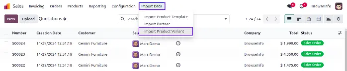 Figure shows the menu for importing data of Product variants.