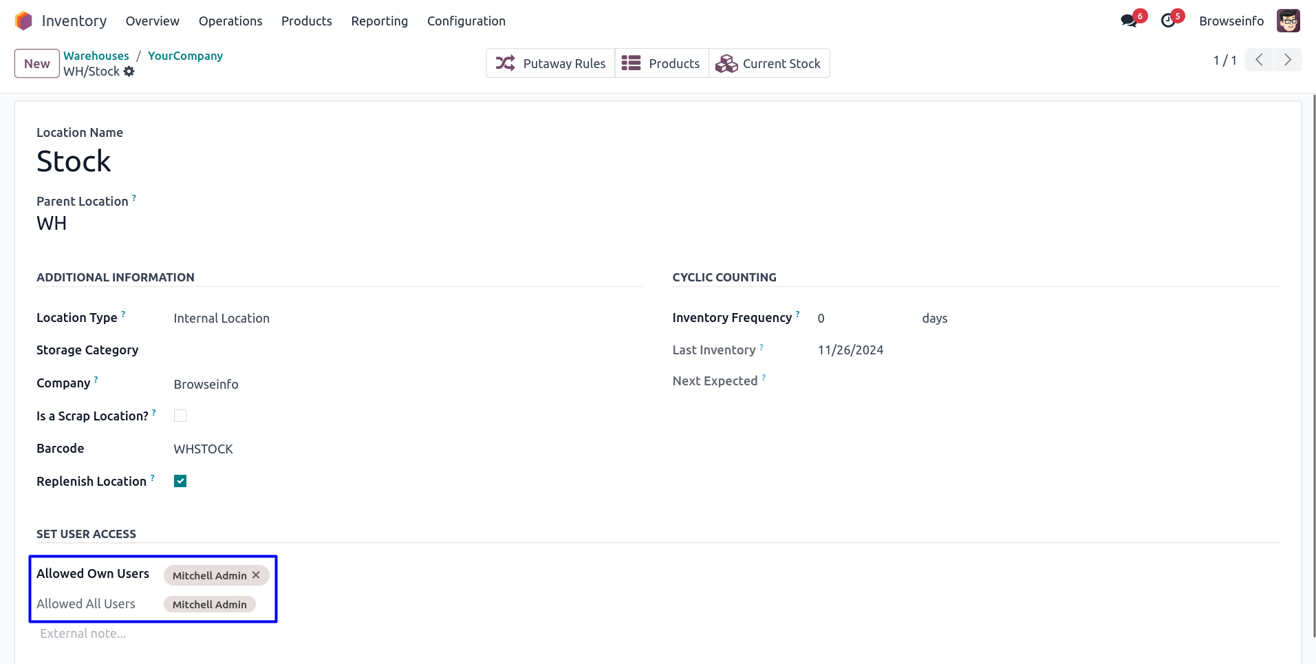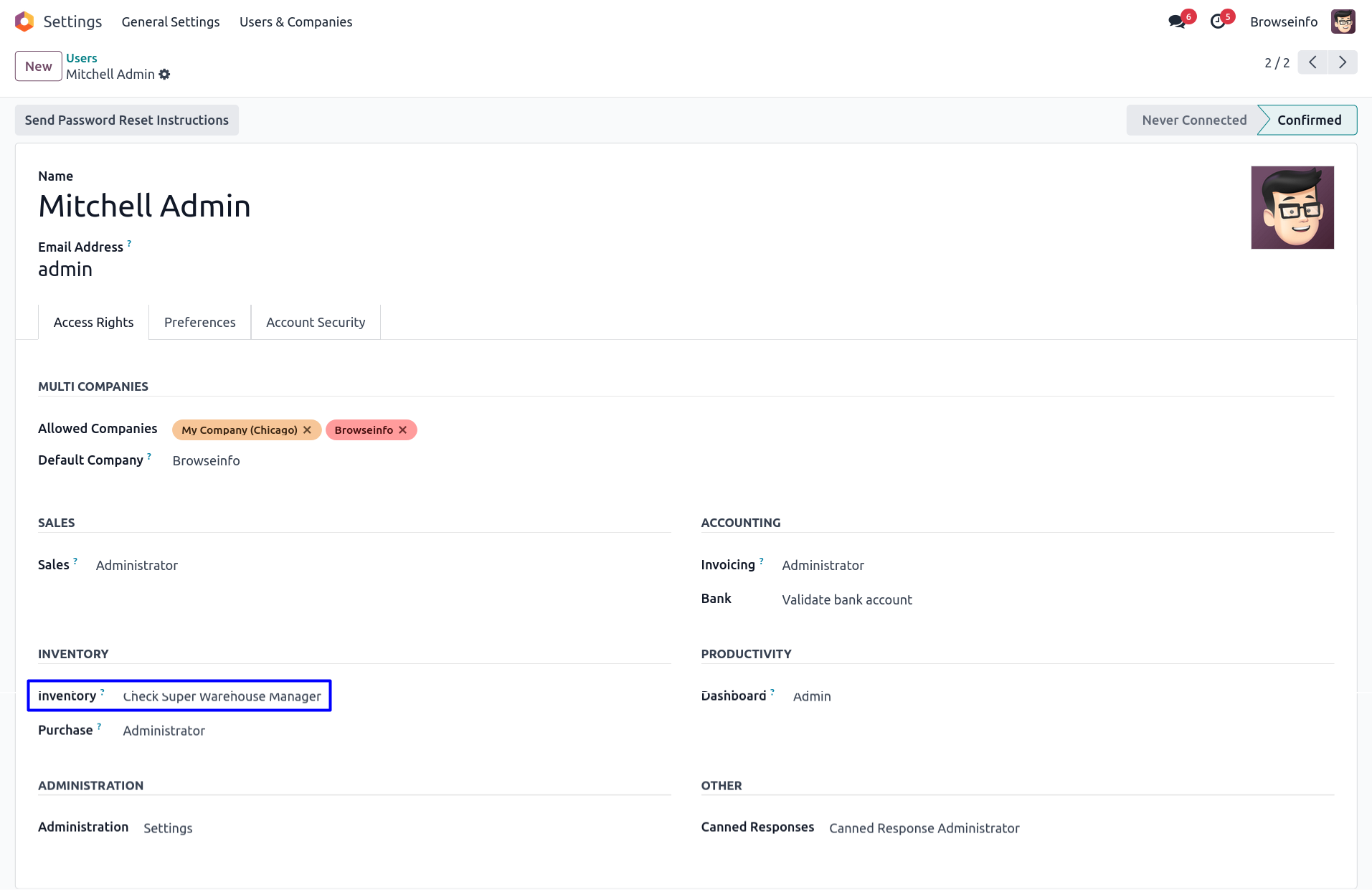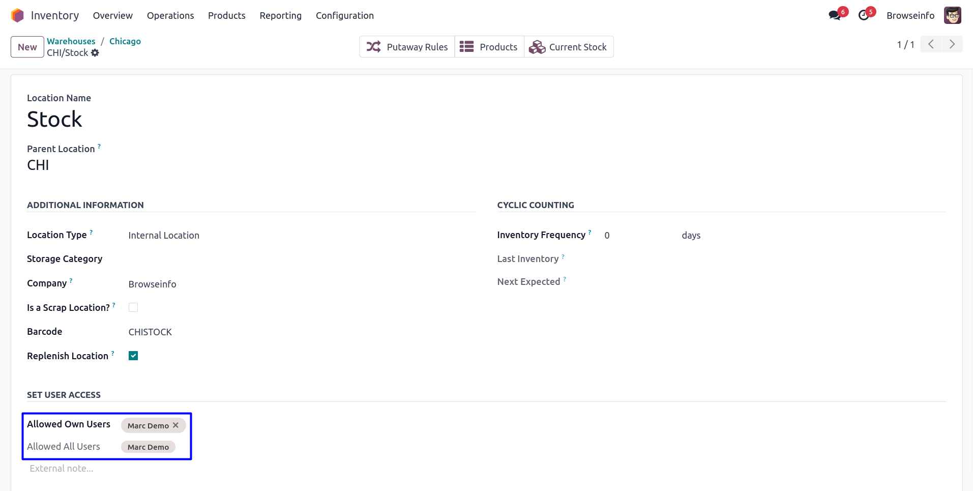 User have to assign access rights as normal user, administrator and super warehouse manage for stock location and warehouse.