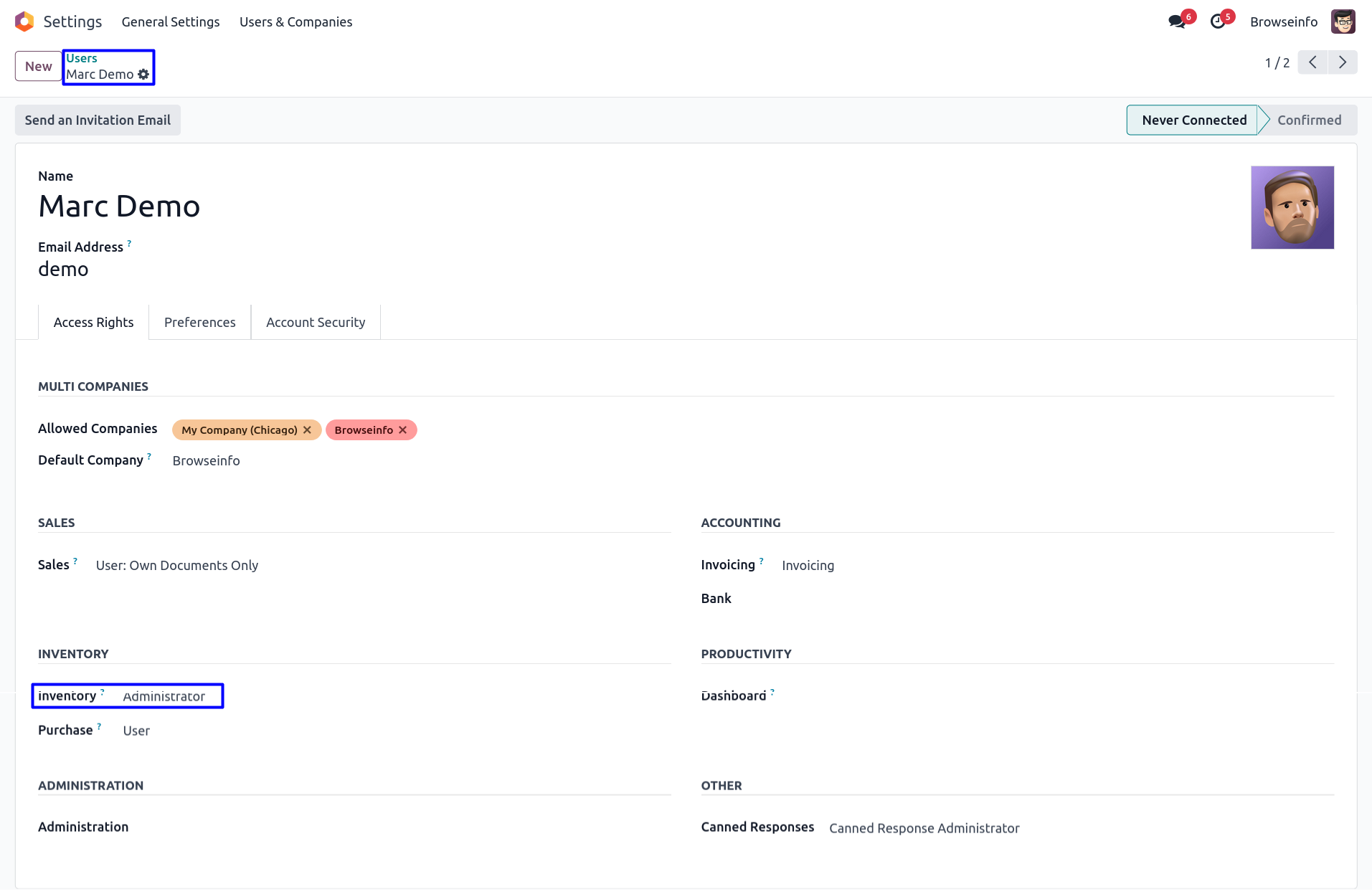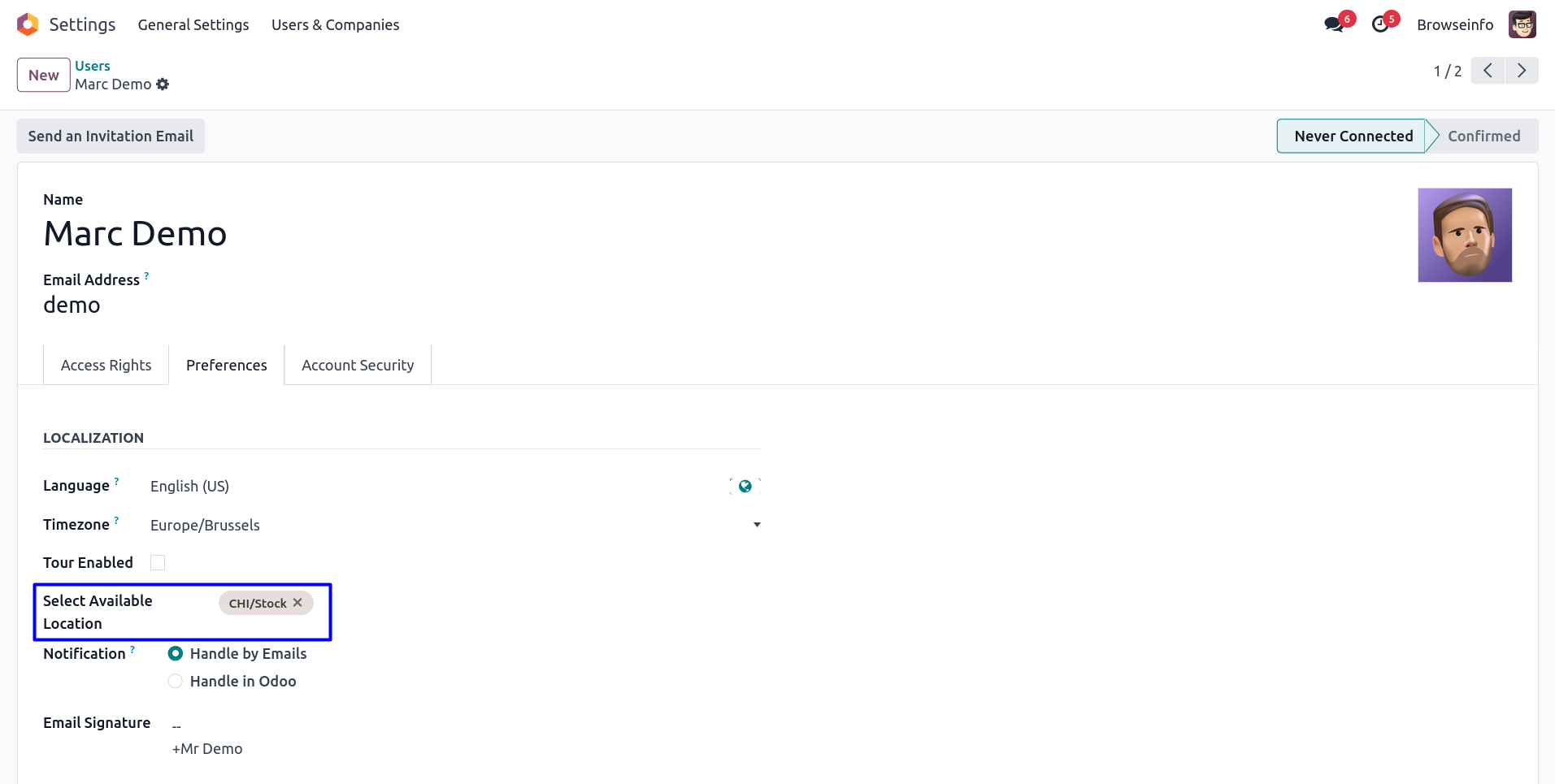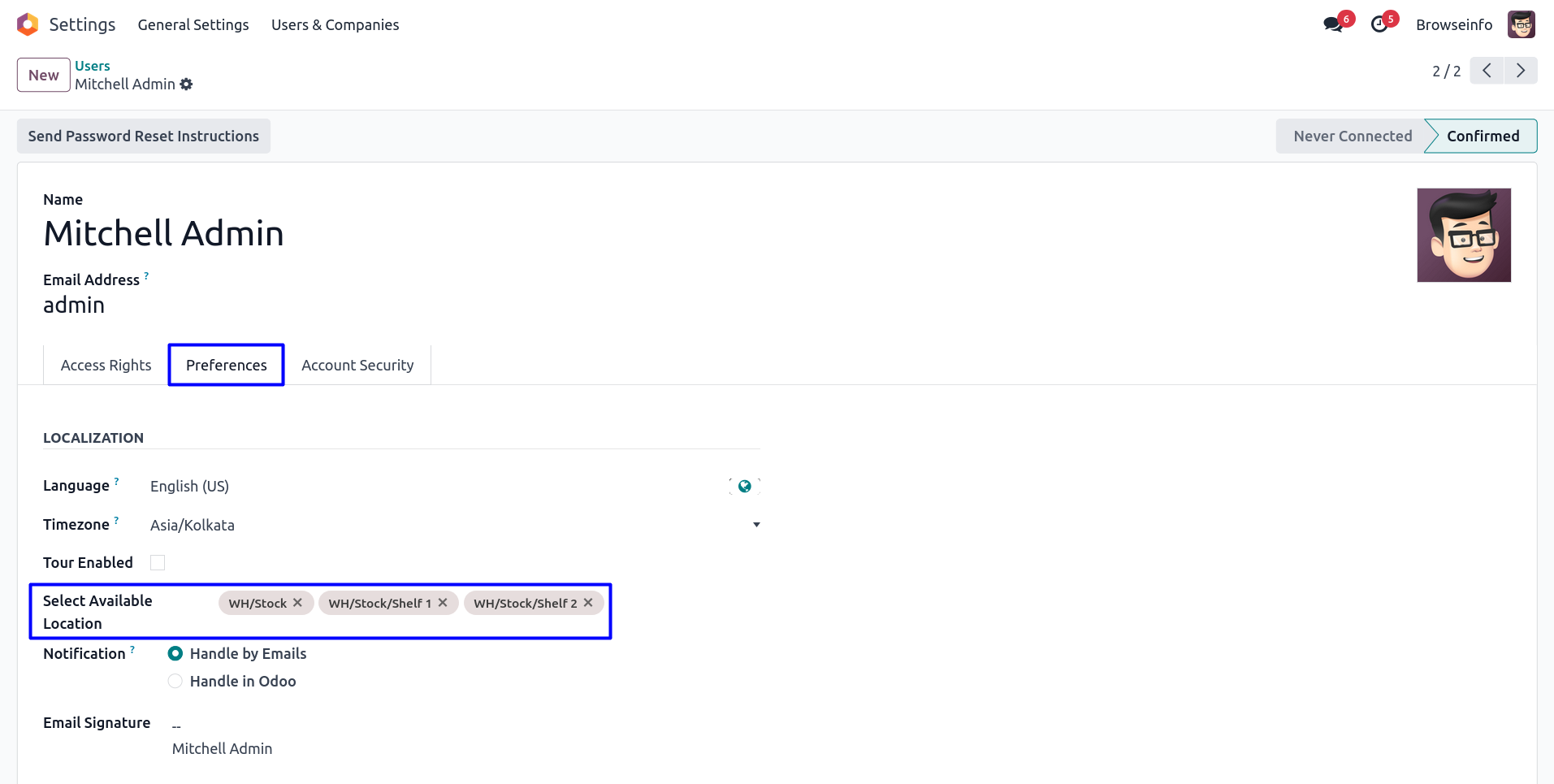 User have to assign access rights as normal user, administrator and super warehouse manage for stock location and warehouse.