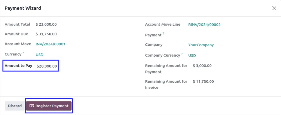 In standard odoo there is no way for partial reconciliation on invoice but this popup you can pay the invoice for partial amount. Amount total field you can see the total invoice value is $5000 and in amount to pay you have to enter how much amount you want to pay for the invoice then once you enter that automatically remaining amount for your outstanding payment it will be show here remaining amount for payment and remaining amount for invoice.
