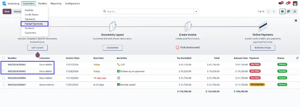 Partial Payments Menu for Multiple Customer Invoice