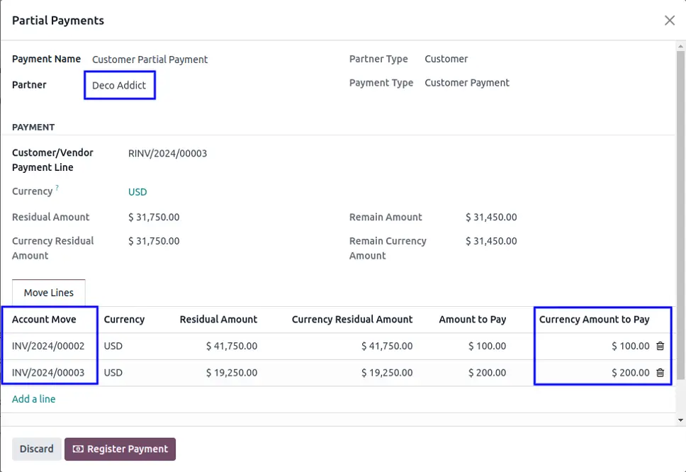 In this wizard you can select partner so according to that partner residual amount will be calculated then select multiple invoices with entered amount to pay so remain amount is calculated. After click on "Register Payment" button.