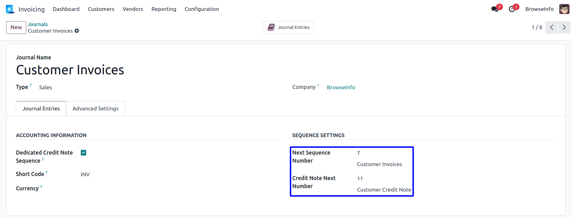 Under Invoicing > Configurations > Journal menu user have to configure journel sequence.