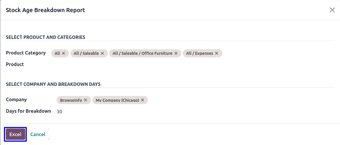 Stock Ageing Break down Report odoo apps helps warehouse user to generate and print product Inventory Age reports in excel format, which included warehouse's total stock of products and aging quantity of products ,total inventory value with aging period .This app also provide filter by company, product and product category on wizard to apply filter on reports and print it on excel format.