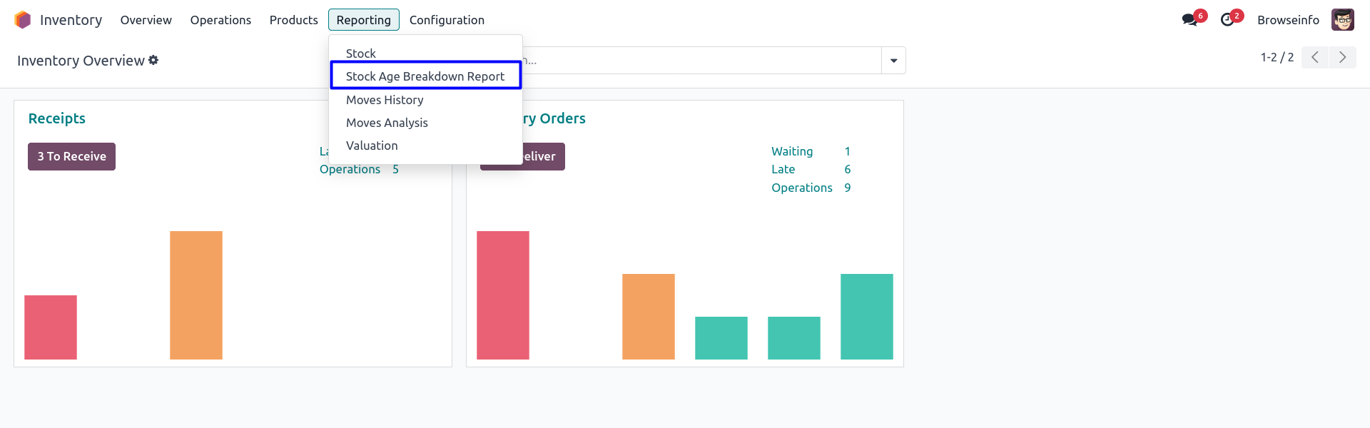 Under Inventory > Reporting menu user can see "Stock Age Breakdown Report" menu.