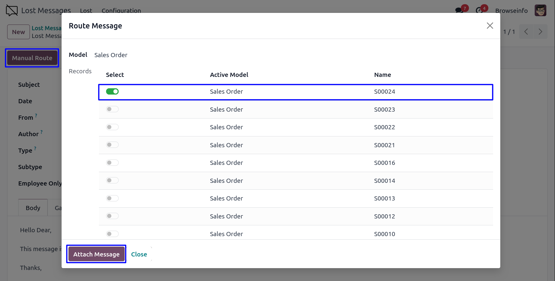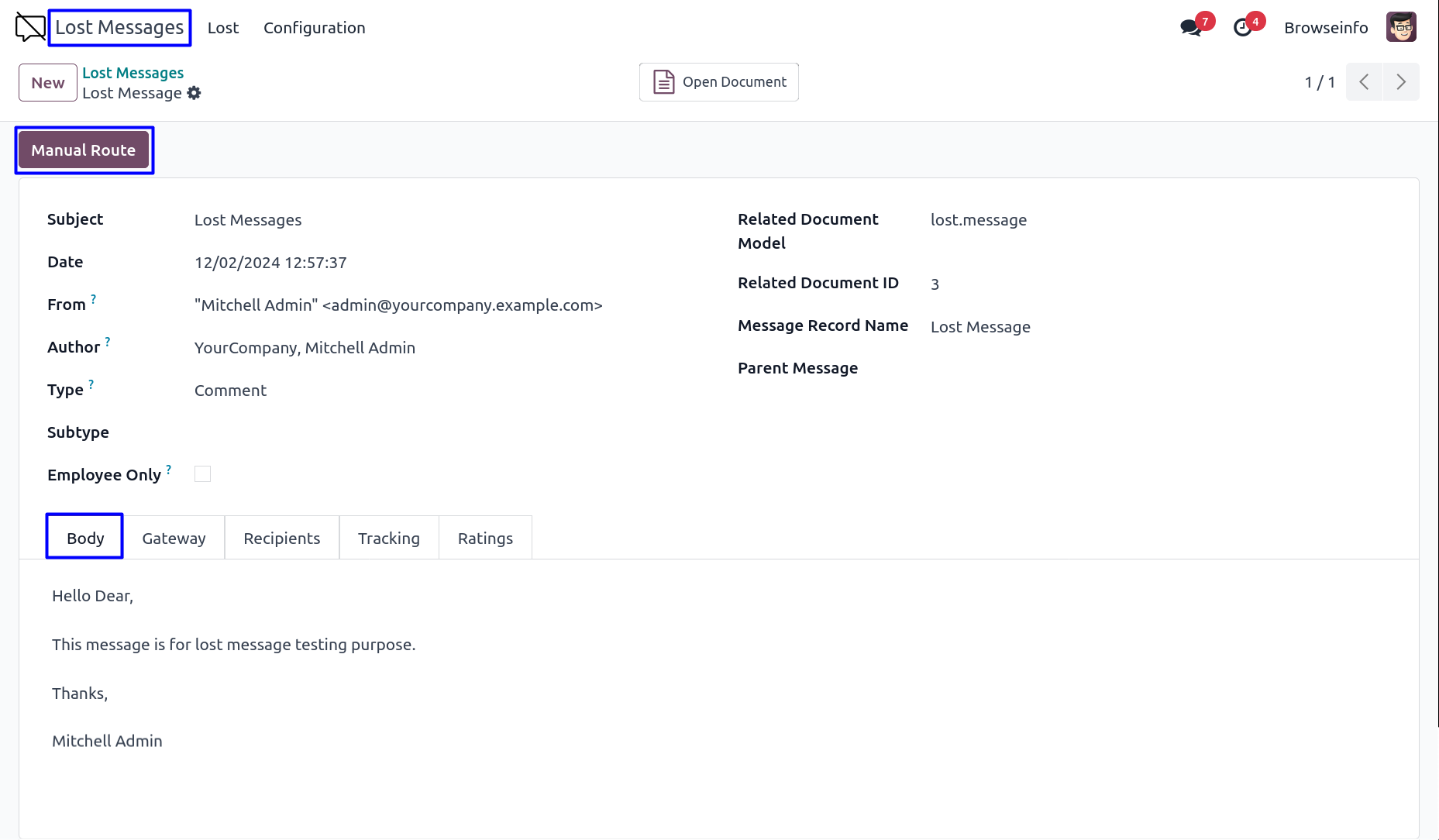 User can view the lost messages which are not managed by Odoo in routing will be marked as a lost On the form there will be a button called "MANUAL ROUTE".