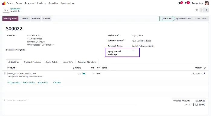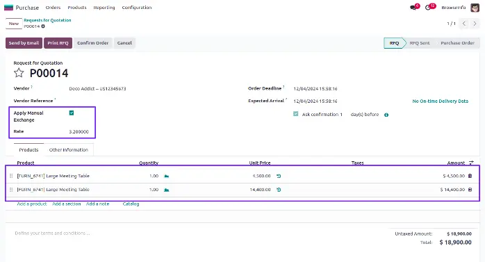 Default Odoo takes exchange rate from the currency configuration/menu and change currency rate daily process is very hard that change currency rate everyday from currency menu for each currency. With help of this Odoo apps you will have option to set Currency Exchange Rates manually/directly on sales order and purchase order on each record and its cover whole work flow of Sales and purchase process on Odoo ERP with apply manual currency exchange rates. After installing this Odoo module you will extra field to apply manual exchange rate on Sales and purchase order) after apply manual exchange rate everything converted with this applied manual exchange rate i.e product price change on order lines)
