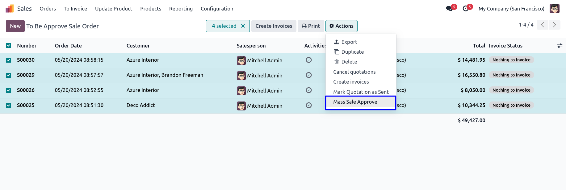User can select multiple sales orders that he/she wans to approve, and under "Action" menu user can see "Mass Sale Approve" menu.