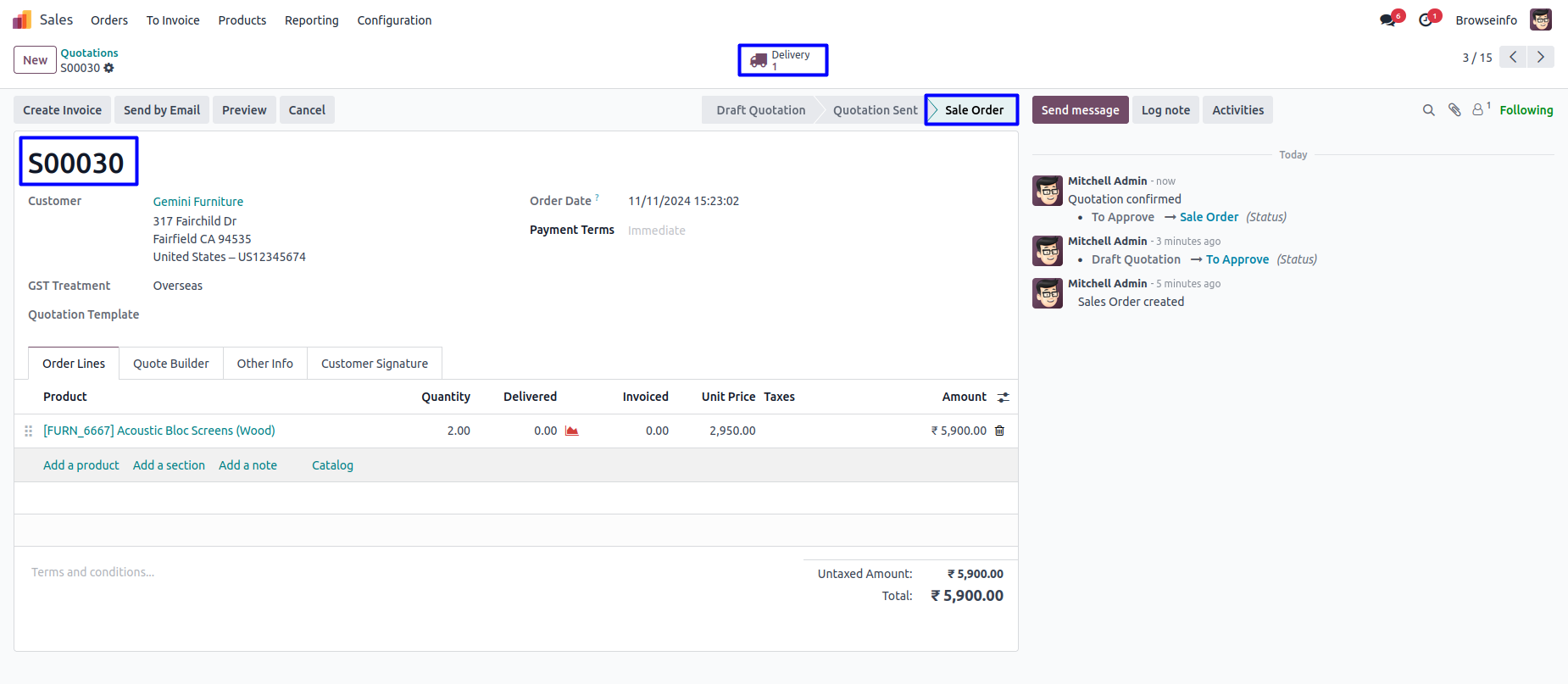 On clicking "Mass Sale Approve" button user can see sales order moved to "Sale Order" state from "To Approve" state, also delivery order is generated.