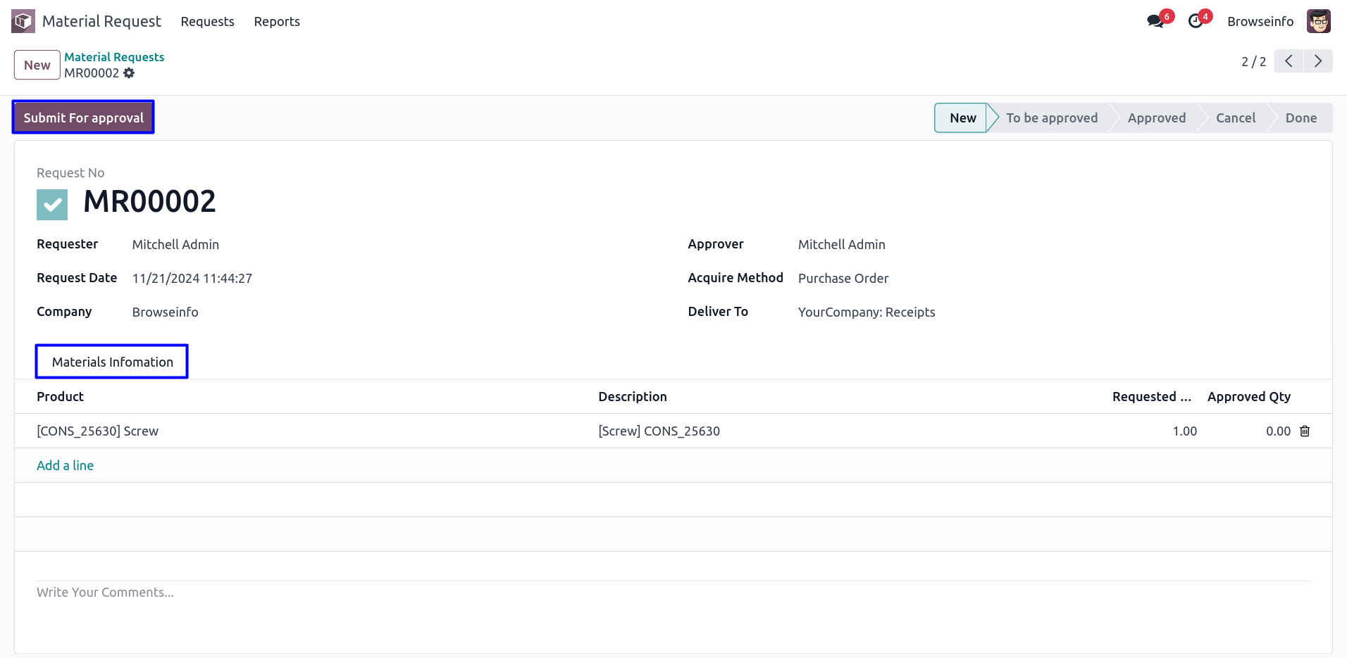 As Submit for Approval is clicked, state of request will be changed from New to To be Approved.